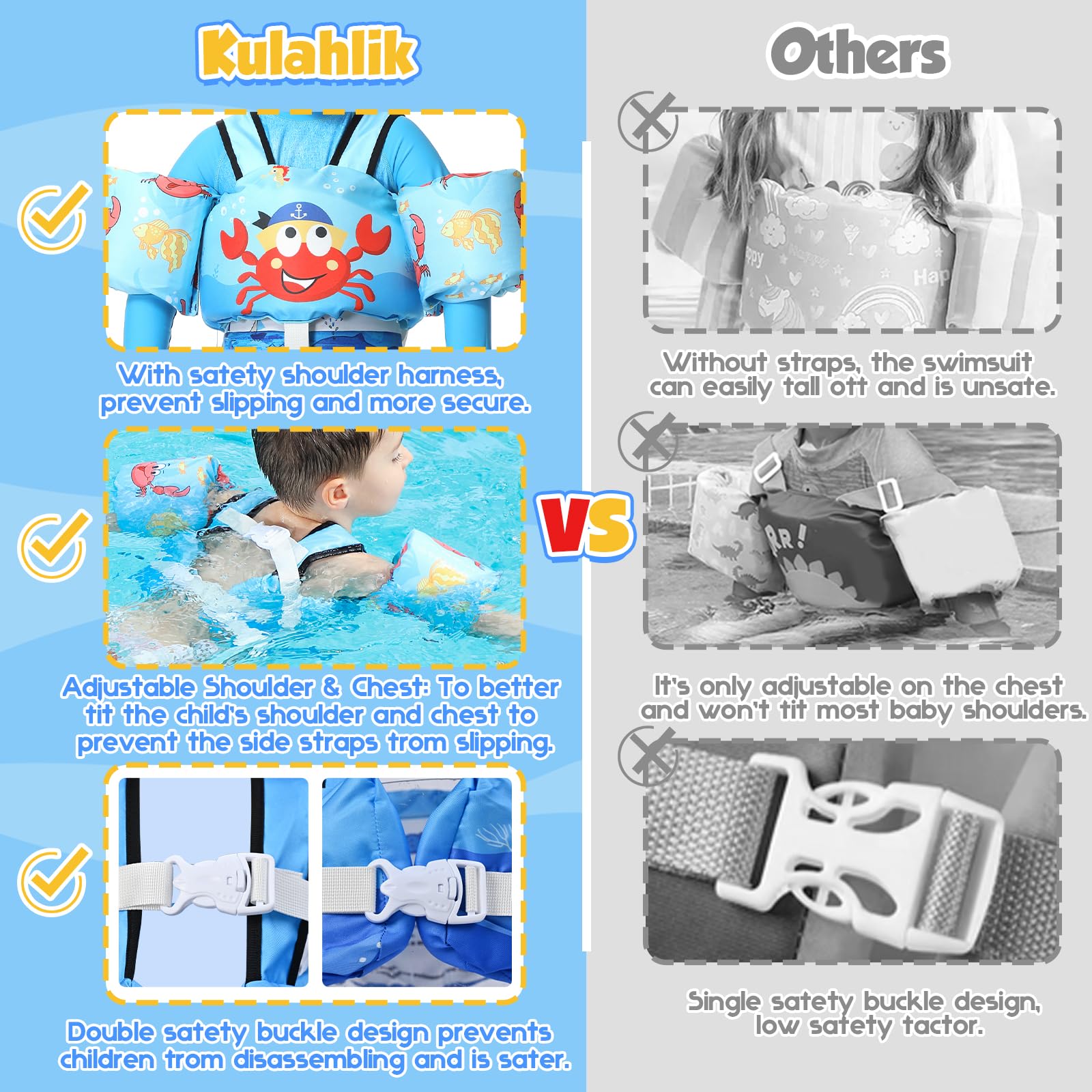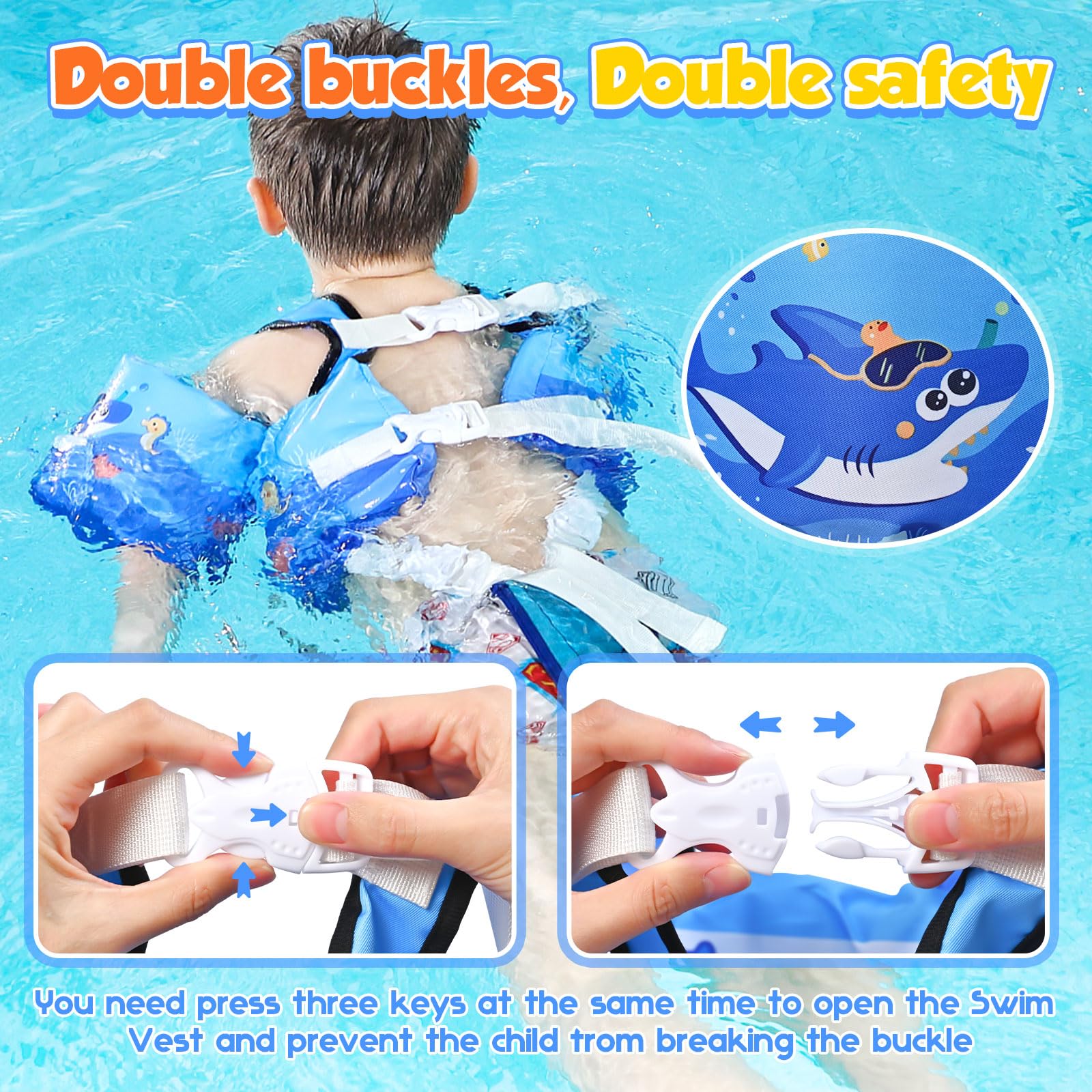 【Double Security】 There are adjustable double safety buckles on the shoulders and back. Our puddle jumper can prevent children from opening it alone. Shoulder straps prevent the vest from slipping during use, and adjustable crotch straps ensure a snug fit. You will have more peace of mind by not having to worry about the tension of the straps coming loose when your child is playing in the water.