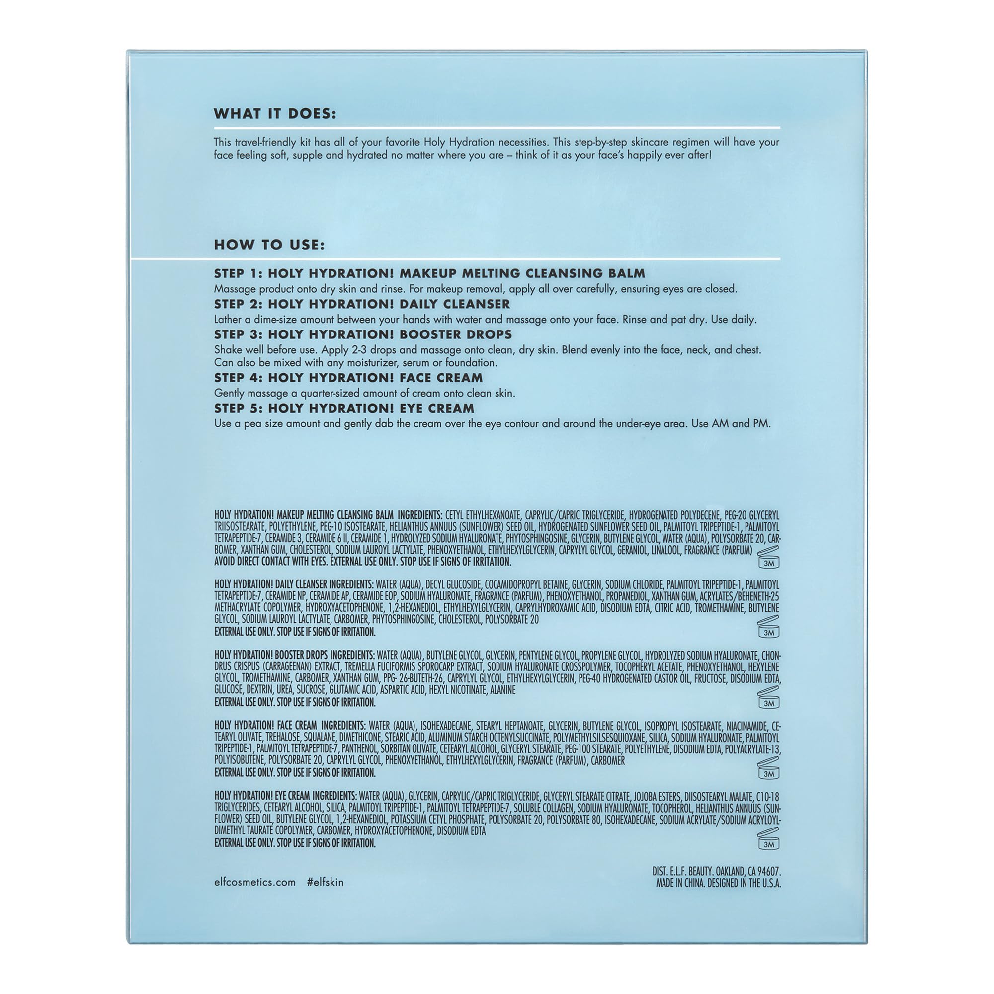 A COMPLETE HYDRATION REGIMEN: This skincare kit has all of your favorite Holy Hydration necessities- a Holy Hydration. Daily Cleanser, Holy Hydration. Makeup Melting Cleansing Balm, Hydrating Booster Drops, Holy Hydration. Face Cream and Eye Cream.