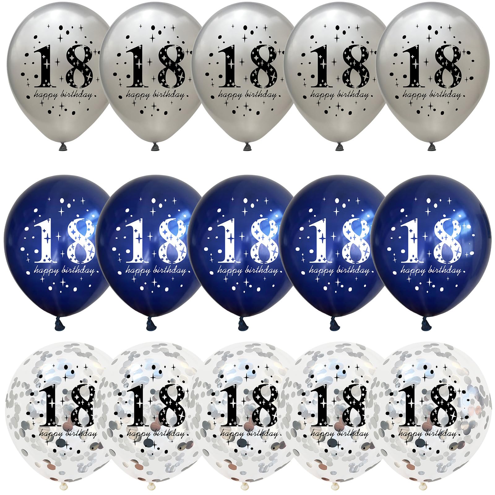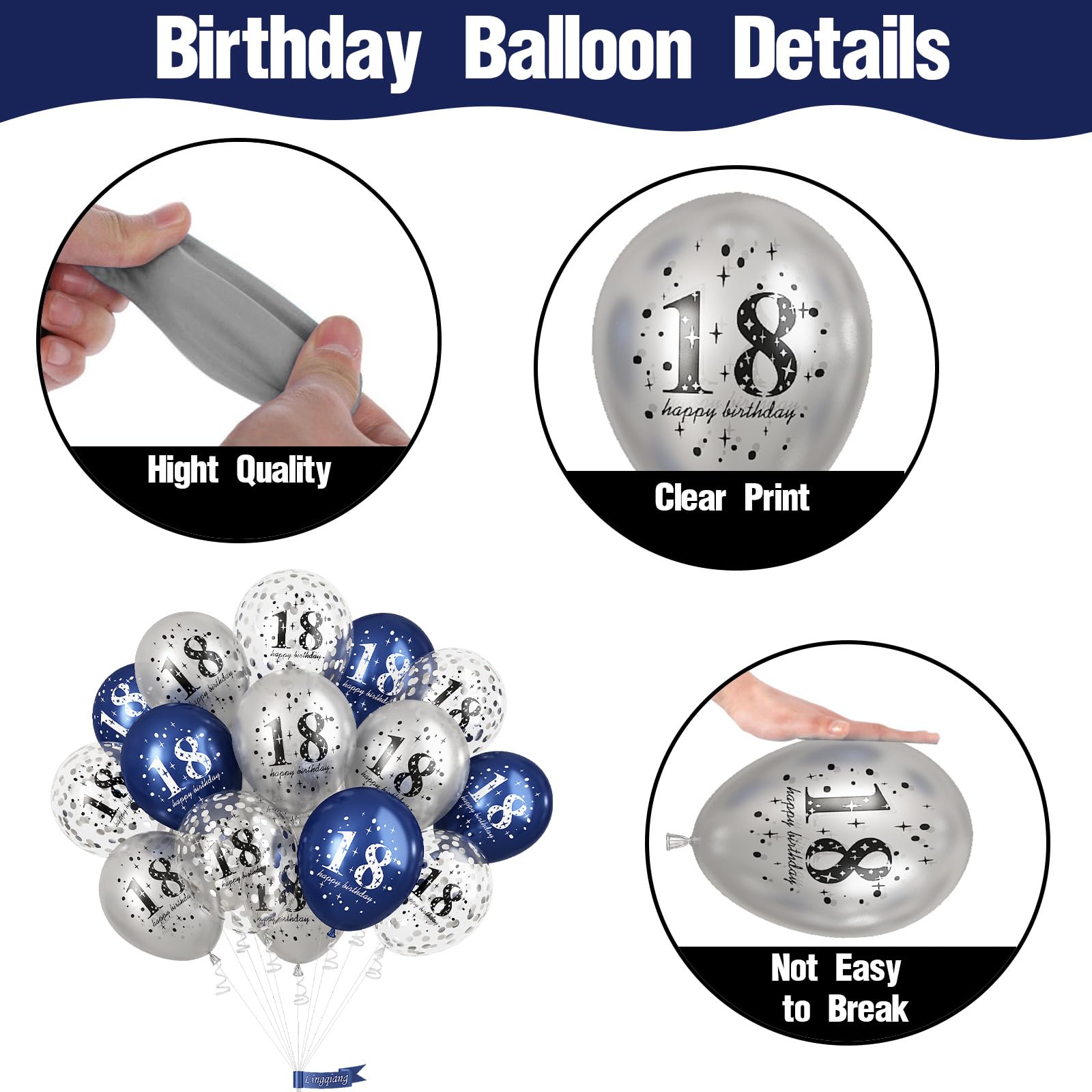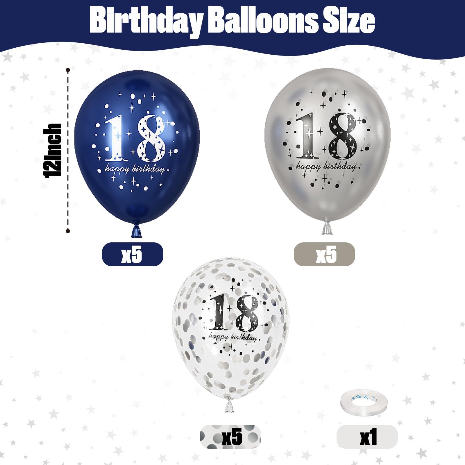 🎂 18th Birthday Balloons - You will get total 15 pieces 12 inch navy blue and silver happy 18th birthday latex balloons, inclulde 5 pcs navy blue print balloons, 5 pcs silver print balloons, 5 pcs silver confetti print balloons, come with a balloon ribbon. Perfect for him boys 18th birthday party decorations supplies.
