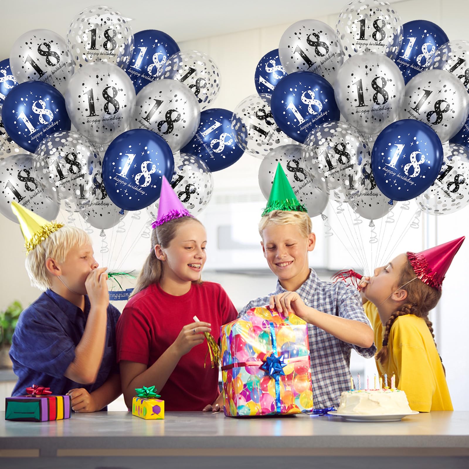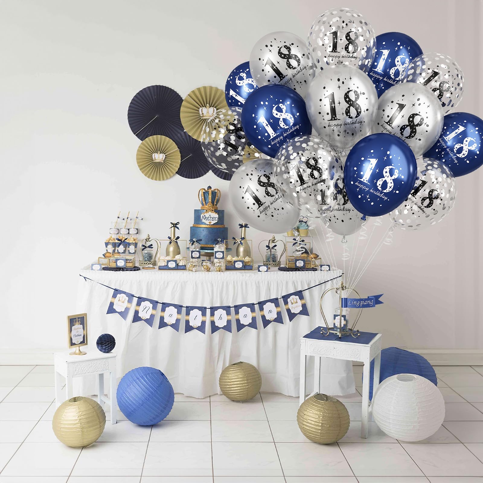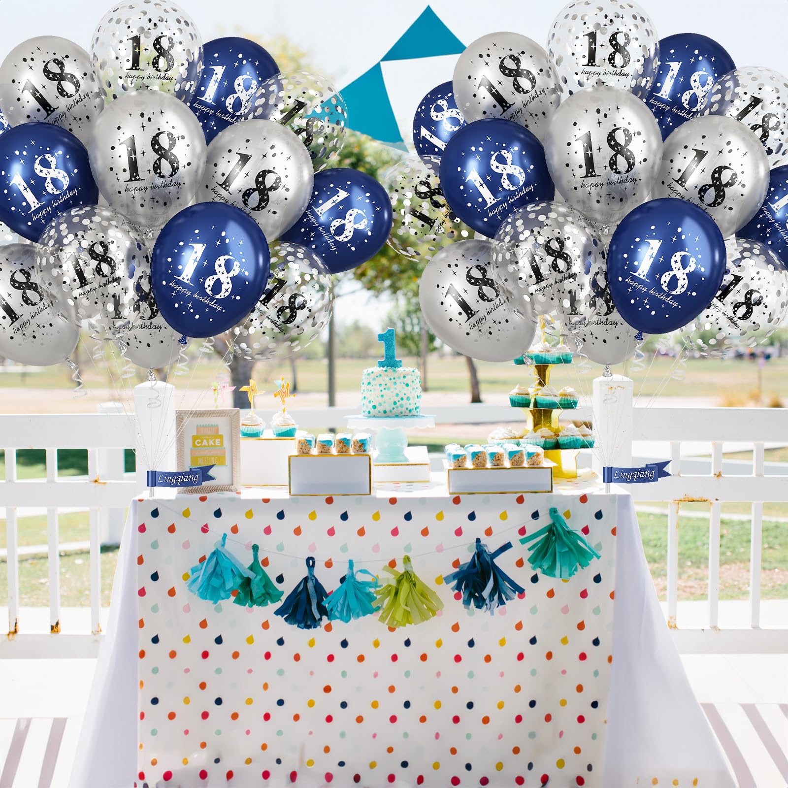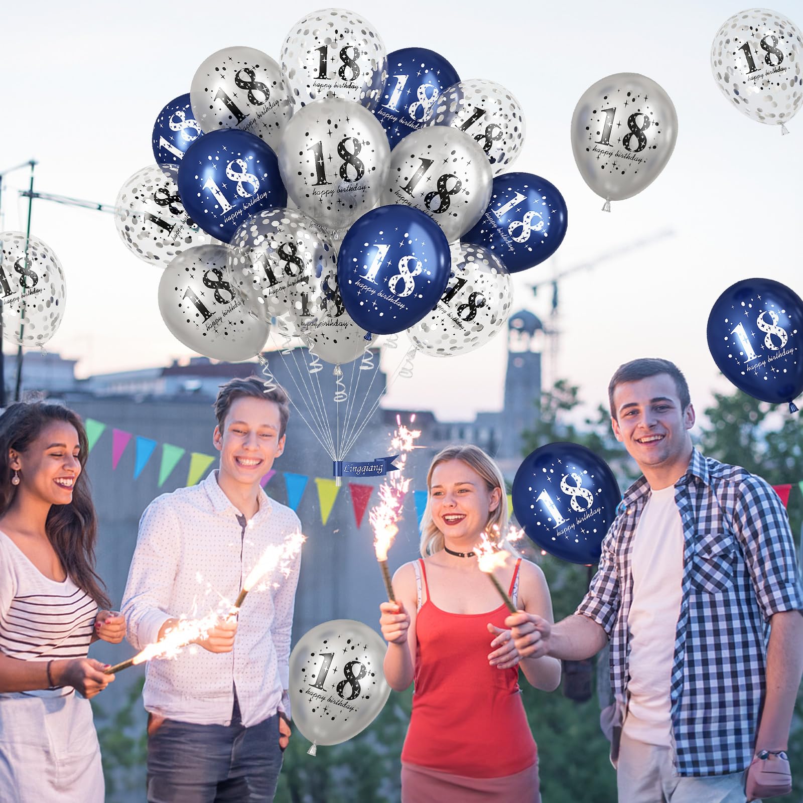🎂 18th Birthday Balloons - You will get total 15 pieces 12 inch navy blue and silver happy 18th birthday latex balloons, inclulde 5 pcs navy blue print balloons, 5 pcs silver print balloons, 5 pcs silver confetti print balloons, come with a balloon ribbon. Perfect for him boys 18th birthday party decorations supplies.