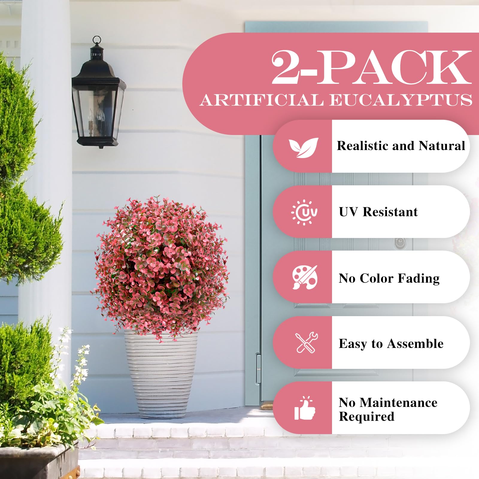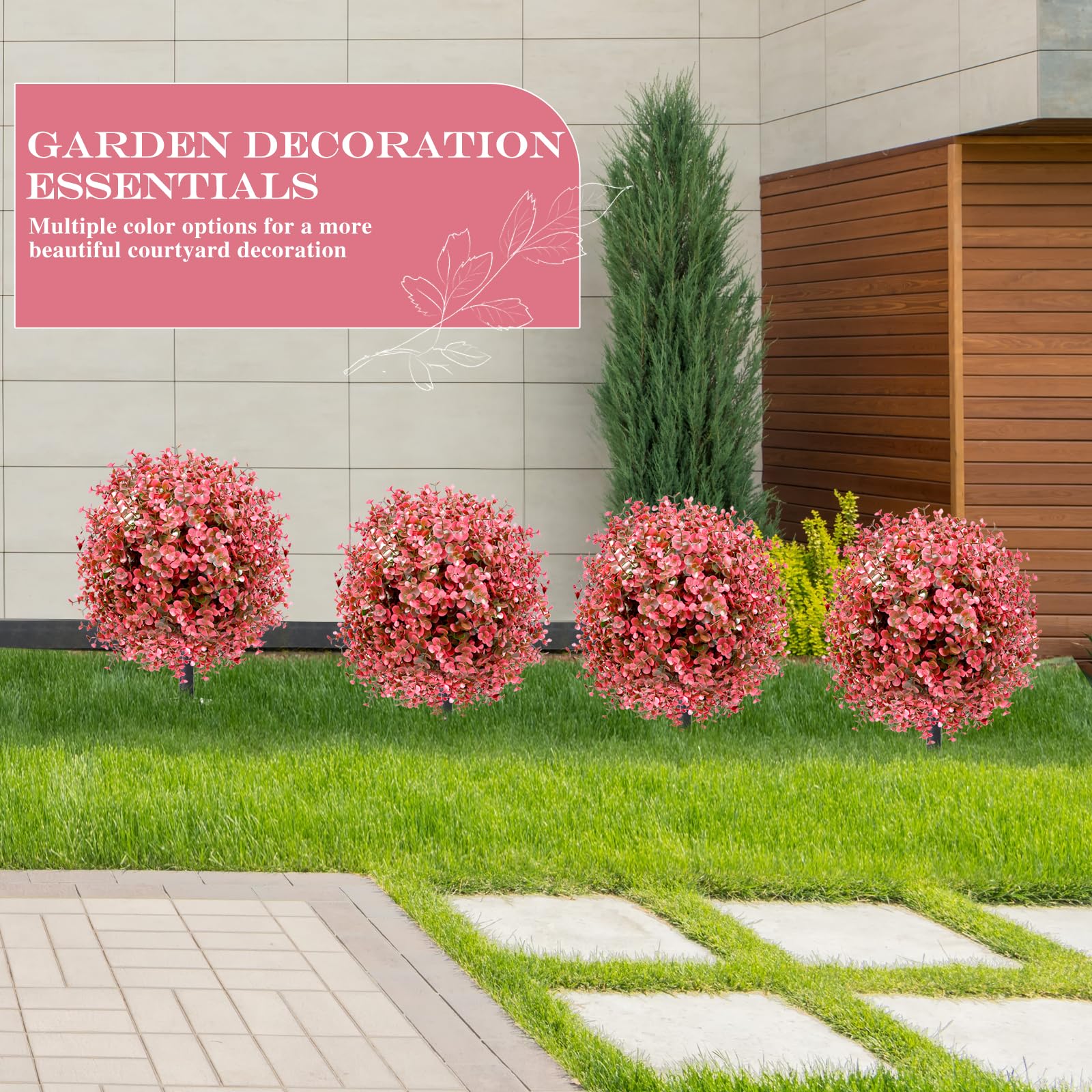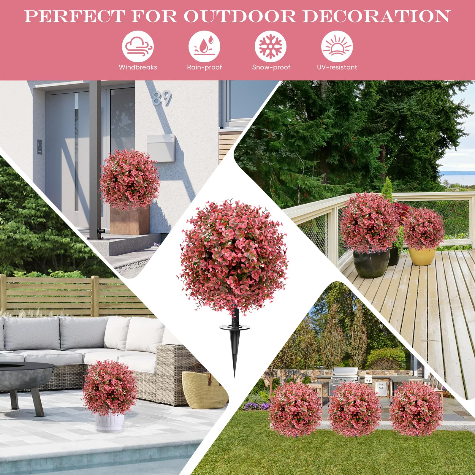 【Year-Round Red – Elegant, Evergreen Appeal】This artificial topiary ball features rich red eucalyptus foliage, densely layered with realistic leaf shapes and natural gradients. The bold color stays elegant year-round—never too bright, never dull. Whether placed alone or with other plants, it delivers reliable outside beauty no matter the season—spring, summer, fall, or winter.