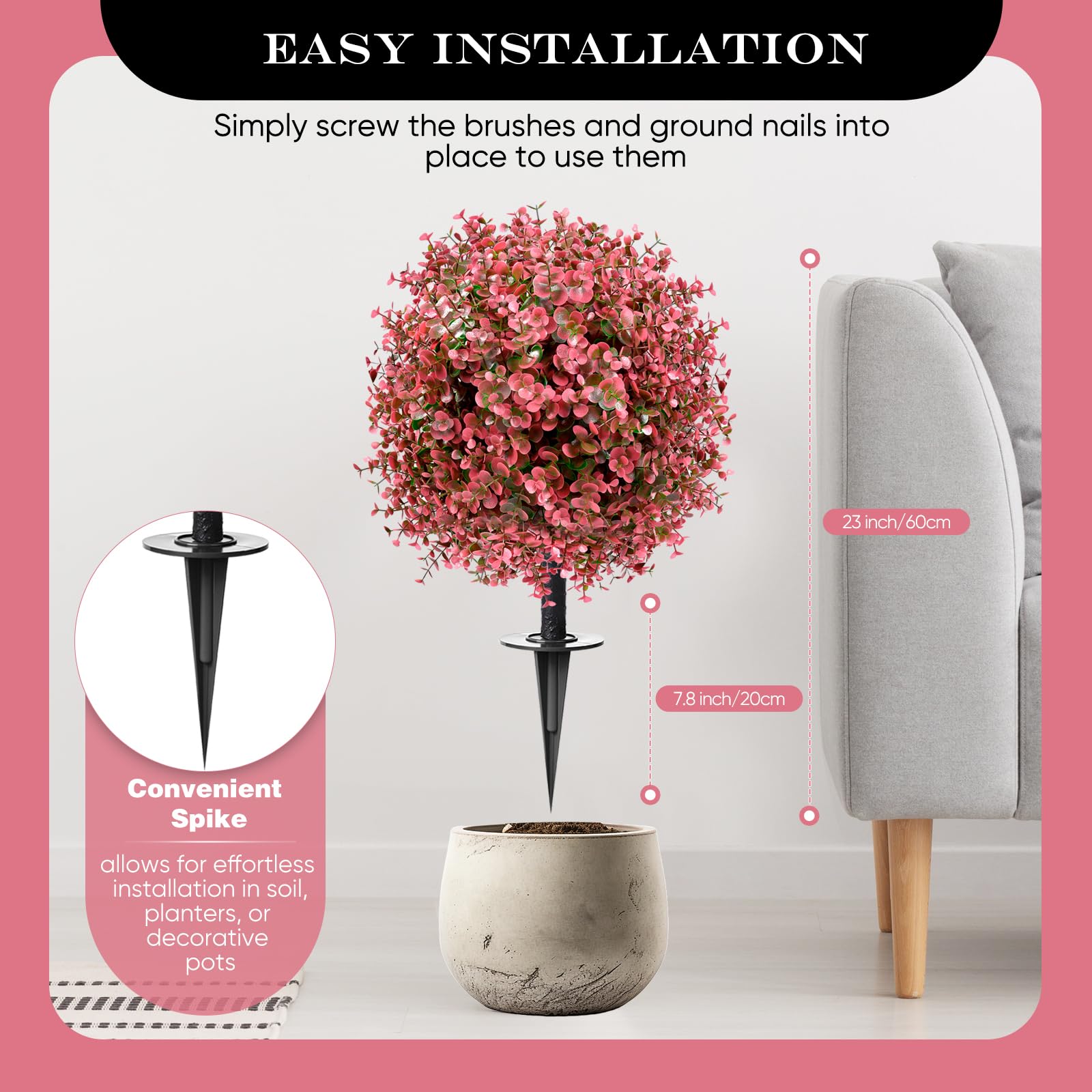 【Quick & Easy Installation – No Tools Needed】Effortless setup in seconds! Simply attach the spike to the base, push it into the ground, or place in a flowerpot. No tools, no mess—just spruce up a front porch, balcony, or walkway, this realistic plant installs in seconds and brings instant charm to your space.