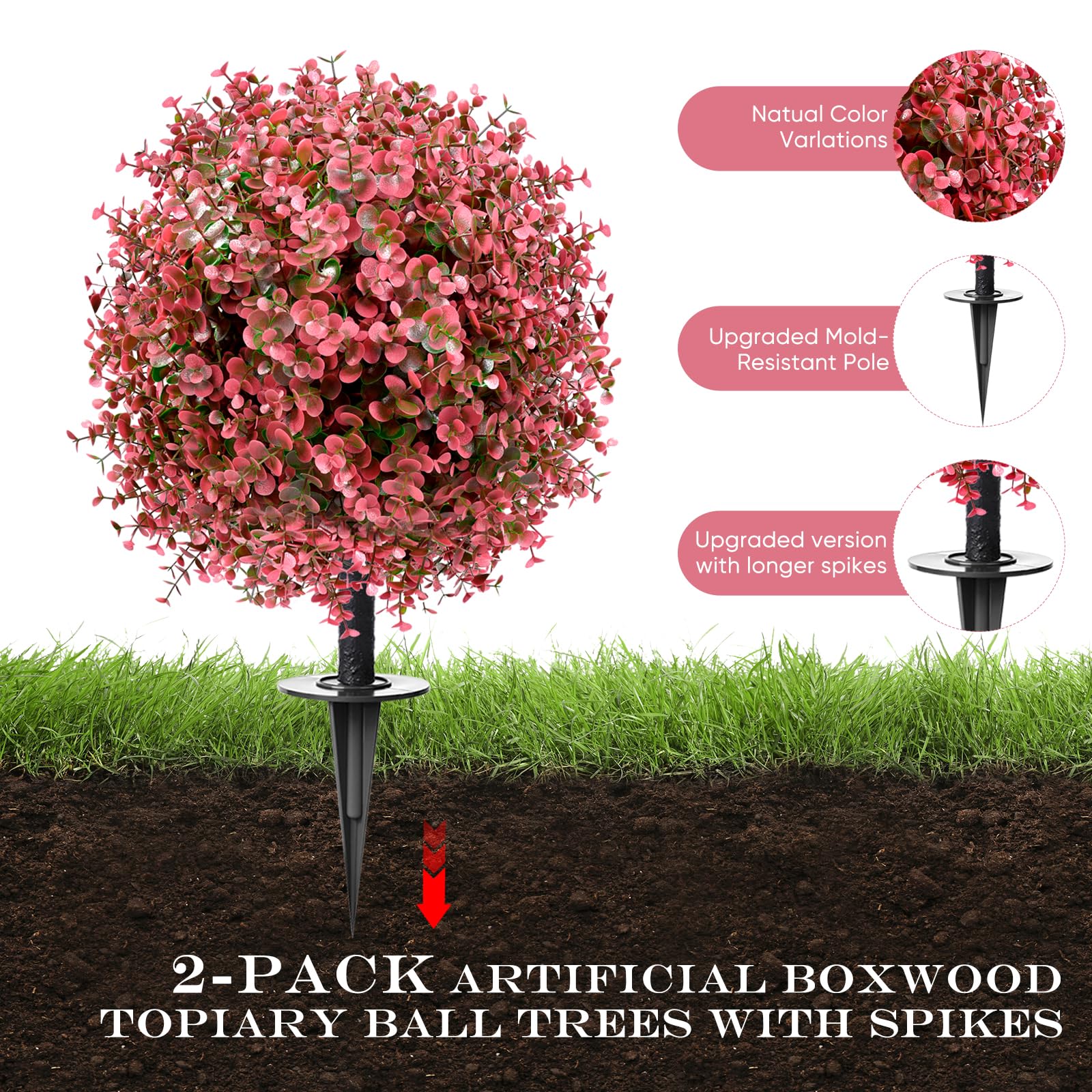 【Upgraded Deep Spike – Stronger Hold in Any Weather】Now featuring a newly upgraded 7.8-inch tapered spike, our artificial shrubs stay firmly anchored in soil, planters, or gravel—even in strong wind or heavy rain. The conical design ensures a secure, weather-resistant hold, making these faux bushes perfect for any outdoor setting, all year long.