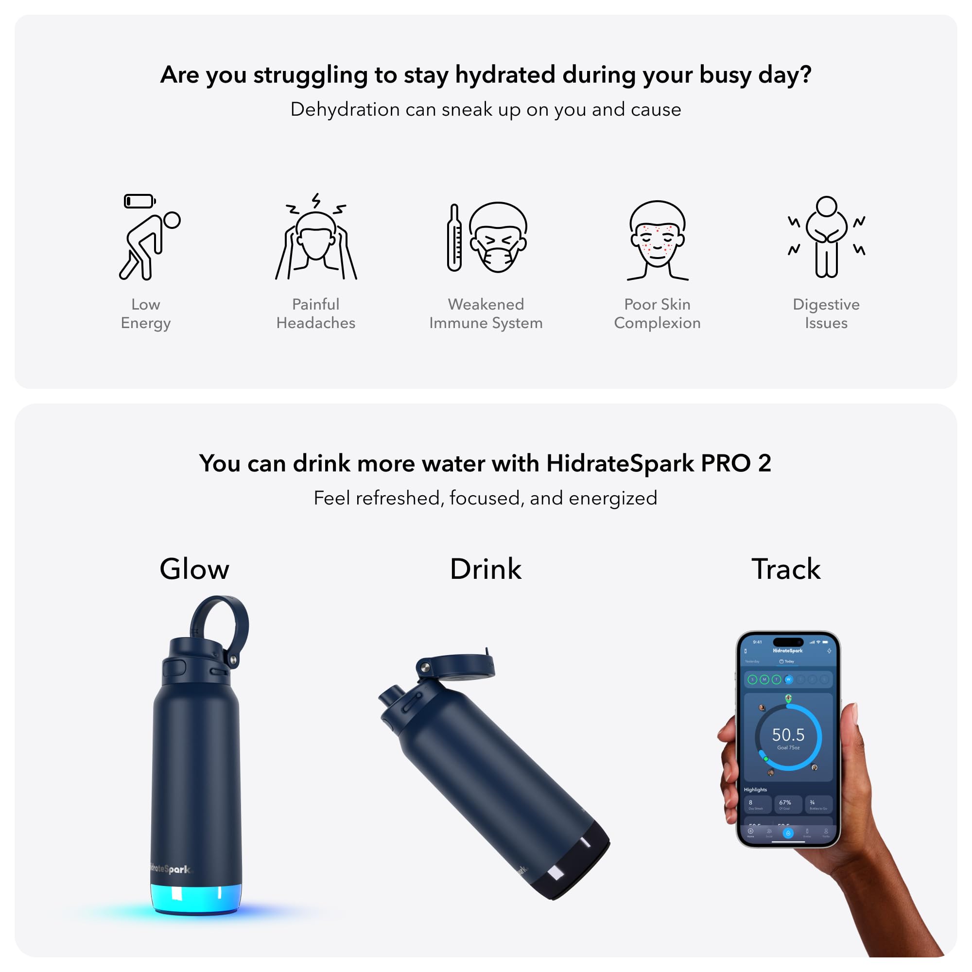 Stay hydrated like never before with the 21 oz HidrateSpark PRO 2, the world’s smartest water bottle made from premium recycled stainless steel. Double-wall vacuum insulation keeps your drink cold for up to 24 hours, while the SipSense Technology in the sensor tracks every sip and reminds you when it’s time to drink with a customizable 360-degree glow and optional sound alerts. Sync your water intake with the HidrateSpark App via Bluetooth to monitor your progress, set personalized goals, and even locate your bottle using Apple’s Find My Network. The large carry handle and narrow base make it cup-holder friendly and easy to carry wherever you go. Works with the chug or straw lid for ultimate versatility.