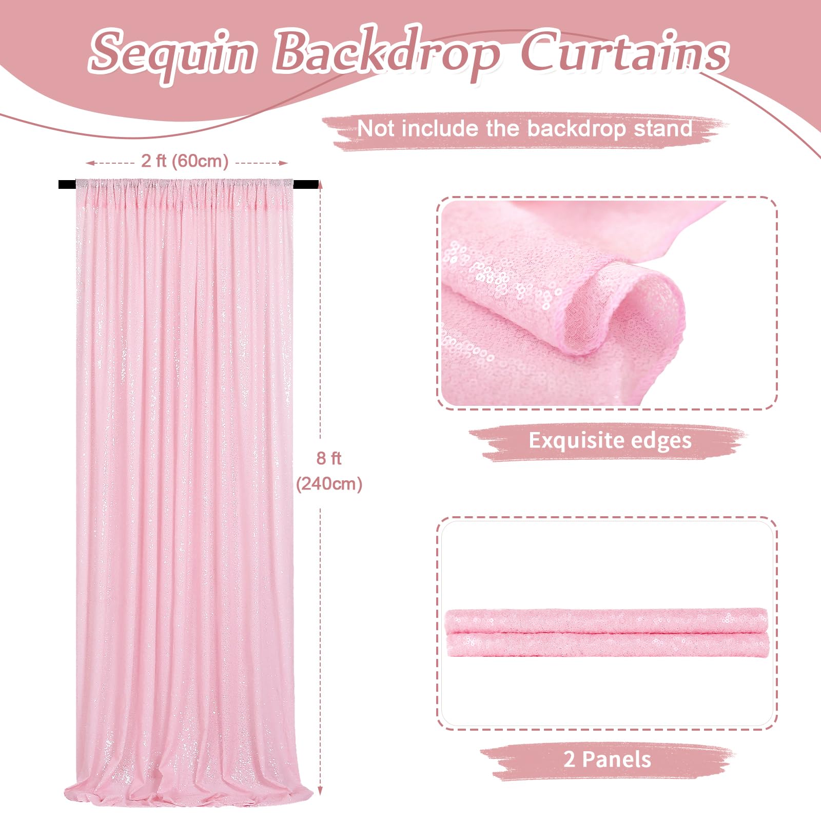 Sequin Backdrop Curtains: Package contains 2Pcs 2ft width by 8ft height backdrop curtains. With a 4-inch rod pocket on the top for easy to be hung on most backdrop stands or curtain rods, and all sides over locked with folded and hemmed edges to ensure the stability during hanging.