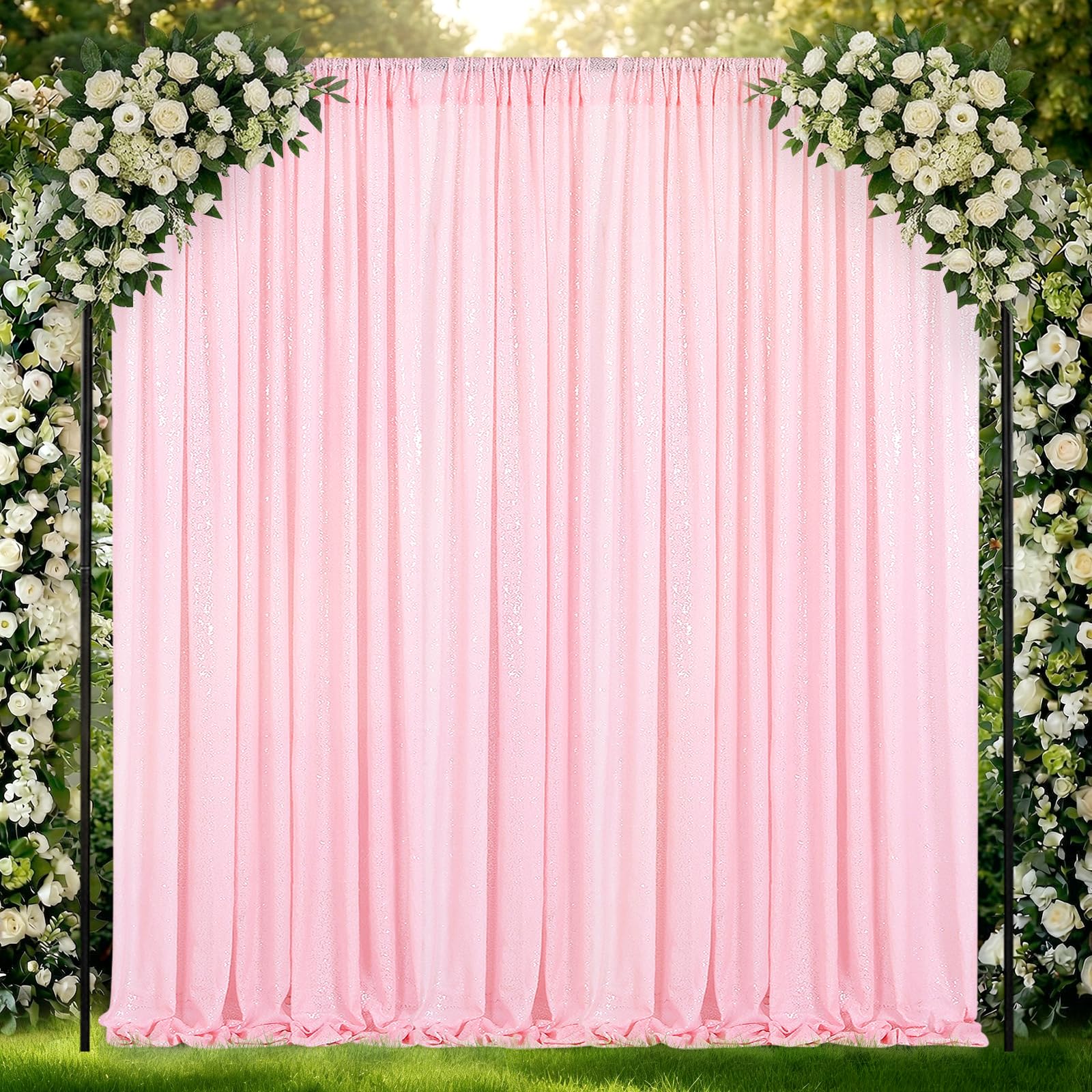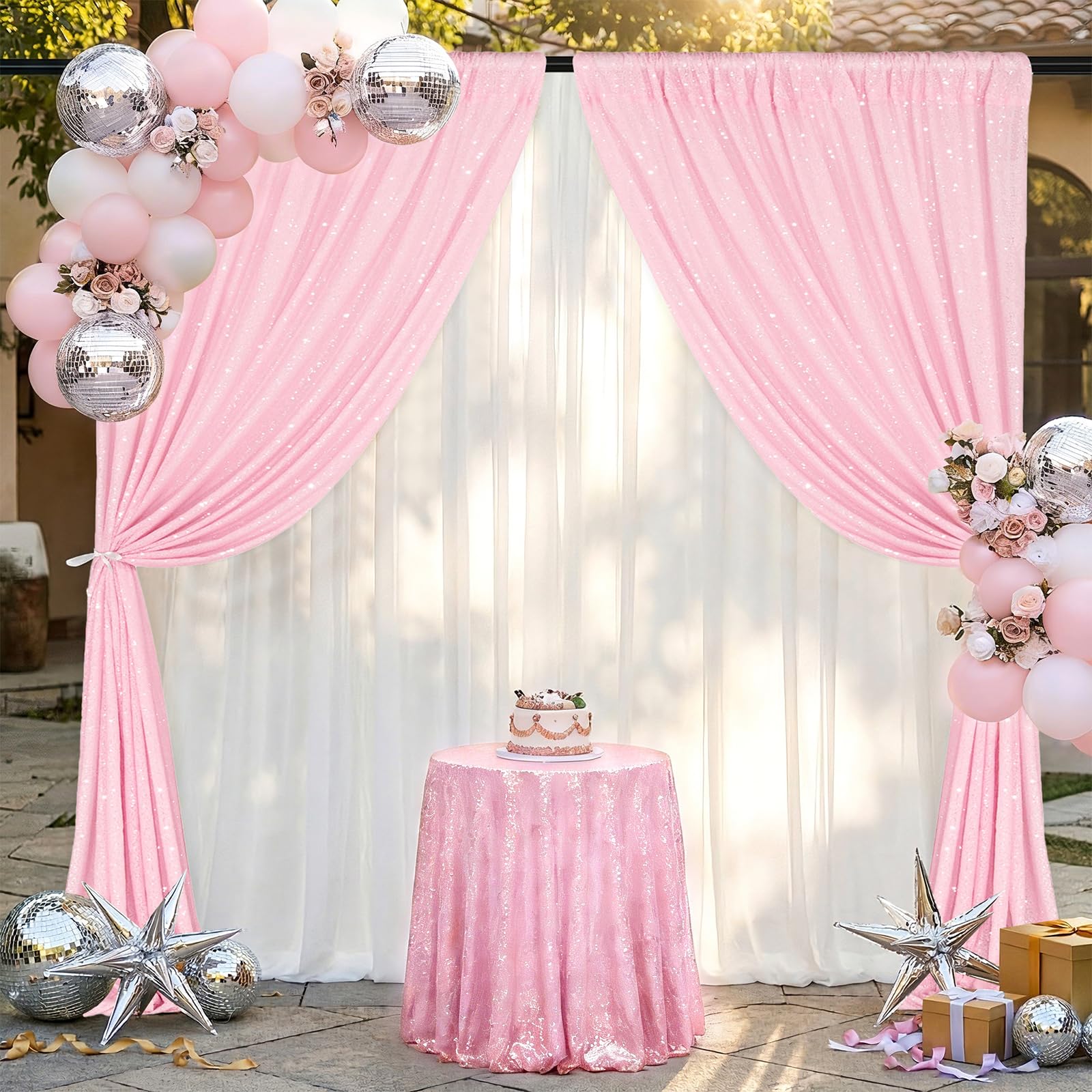 Pro Tip:For a flawless look, unfold and gently shake the backdrop curtain to clear any minor packaging debris before you use it. If you want to enhance the rich pink tones, we suggest adding a solid-colored backdorp layer on the back of the backdrop curtain. The sequin backdrop curtains is recommended to dry clean, do not machine wash and iron, the durable material can be reused.