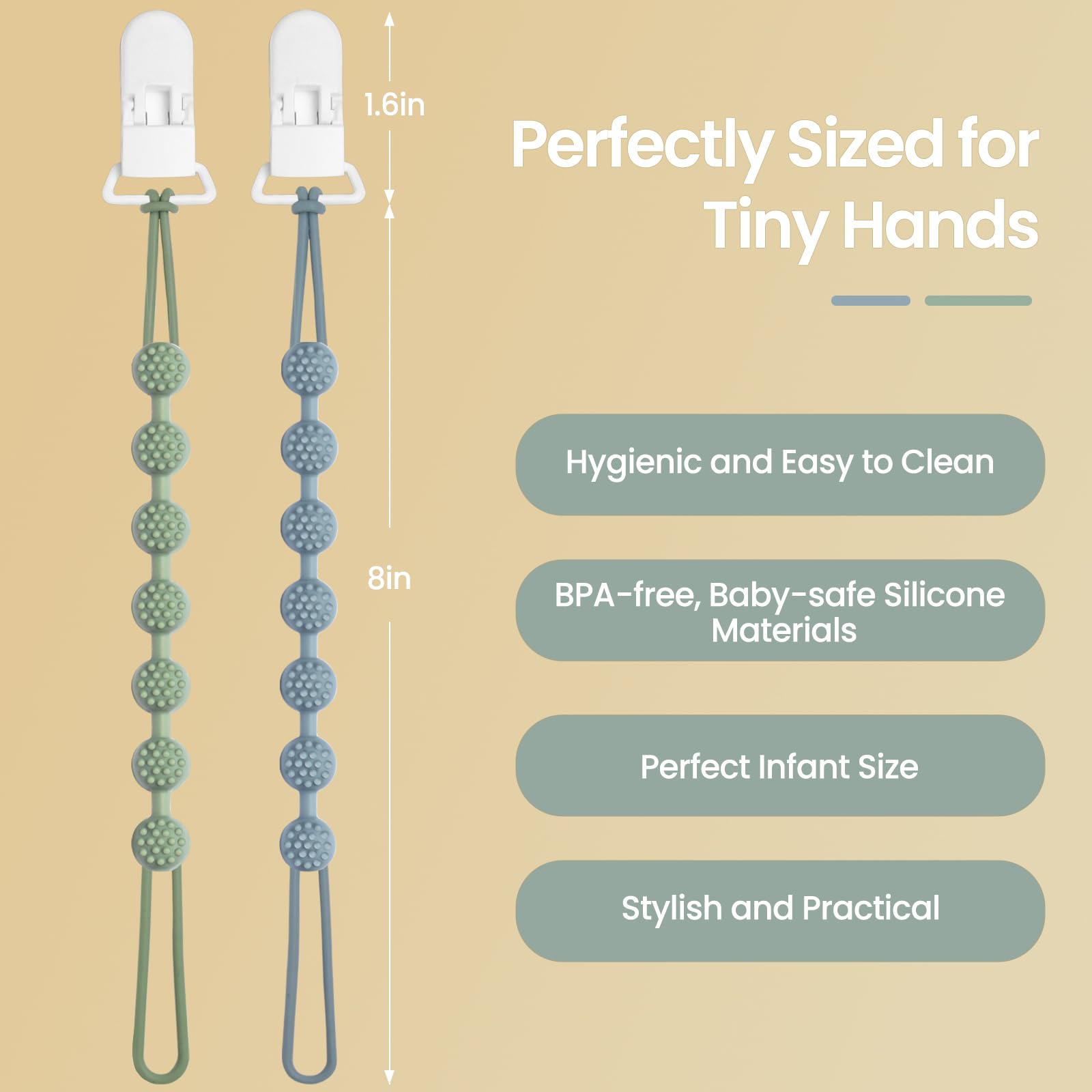 Ideal for Parents: our silicone pacifier clip is small, lightweight and flexible, whether you're traveling or out for a walk, your baby's pacifier is always within reach, say goodbye to losing the pacifier and the worry of getting the pacifier dirty!