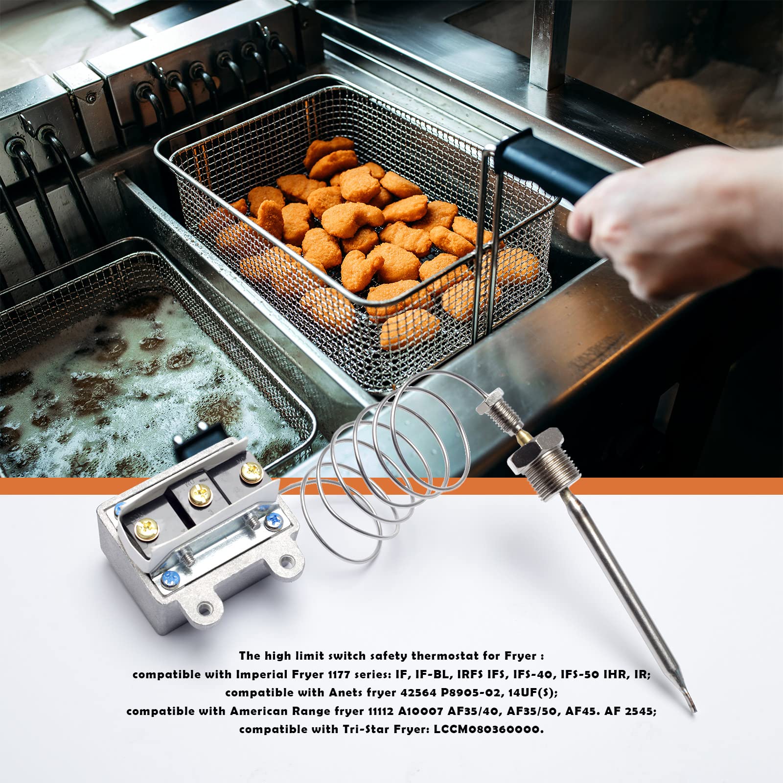 The high limit switch thermostat for Fryer compatible with Imperial Fryer 1177 series: IF, IF-BL, IRFS IFS, IFS-40, IFS-50 IHR, IR; compatible with Anets fryer 42564 P8905-02, 14UF(S); compatible with American Range fryer 11112 A10007 AF35/40, AF35/50, AF45. AF 2545; compatible with Tri-Star Fryer: LCCM080360000.Compatible with Adcraft LCCM2003000 LCCM200300000