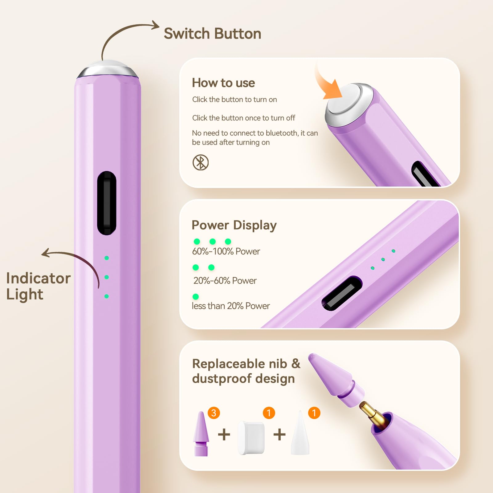 🖊【Battery Display/No Bluetooth Required】:No need for Bluetooth connection, turn on this stylus pen by simply touching the cap button. Hastraith ipad pencil has 3 battery indicator lights: All lights on: 70%-100% power, 2 lights on: 30%-70% power, 1 light on: 5%-30% power, 1 light flashing: less than 5% power. Therefore, you can view the battery consumption progress in real time so that you can charge it before important work begins.