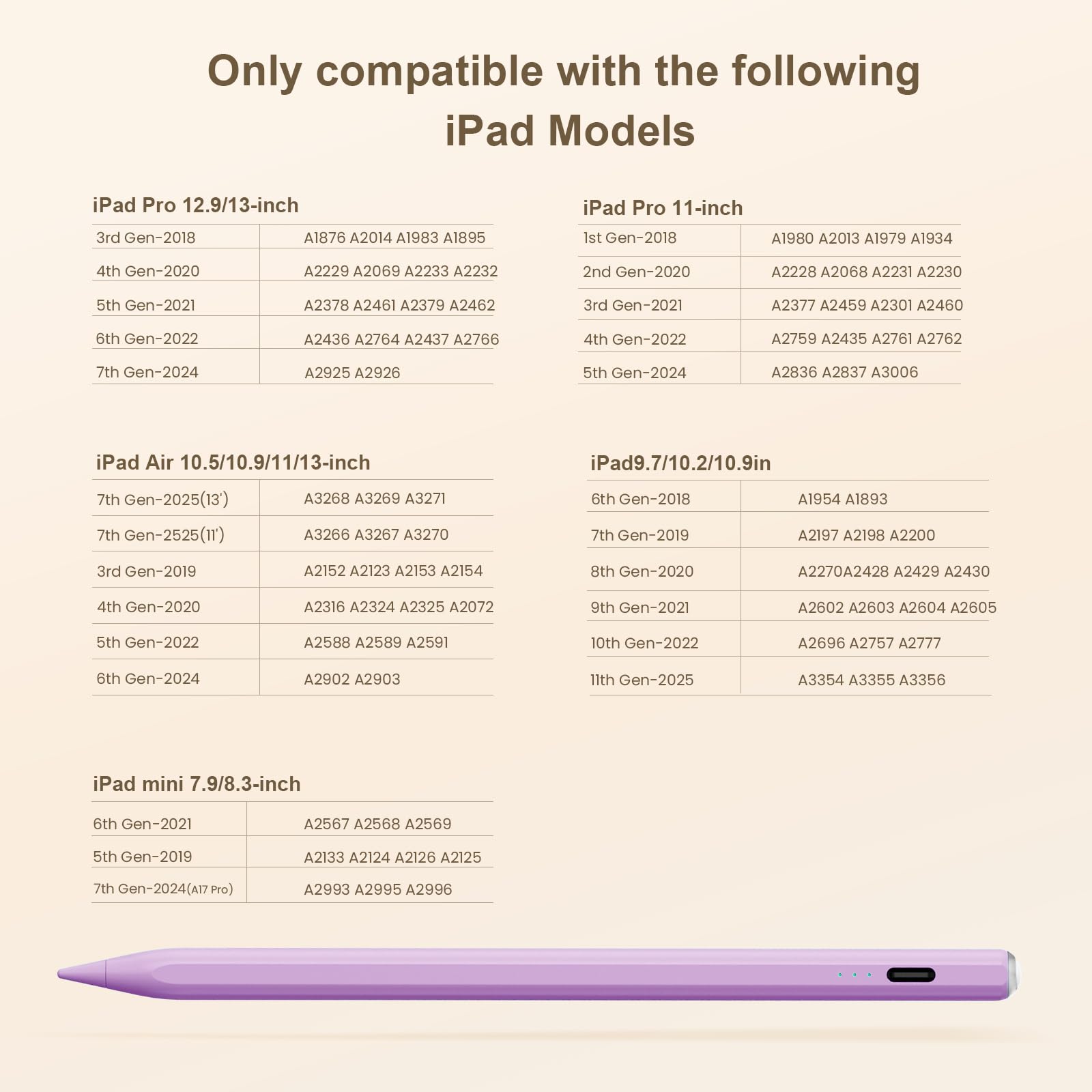 🖊【Wide Compatibility】: Stylus pen supports iPad 2018-2026 series:iPad 11th 11 inch 2025/10/9/8/7/6th Gen,iPad Air 11 inch (M4) 2026/13 inch (M4) 2026/7/6/5/4/3th Gen,iPad Pro 13 inch M4,iPad Pro 12.9 inch 3/4/5/6th Gen,iPad Pro 11 inch 1/2/3/4th/M4,iPad Mini 7th (A17 Pro)/6/5th Gen.NOTE: The Pencil is NOT compatible with iPad models before 2018, iPhone, Android and Microsoft devices. Please check your product model before placing an order.
