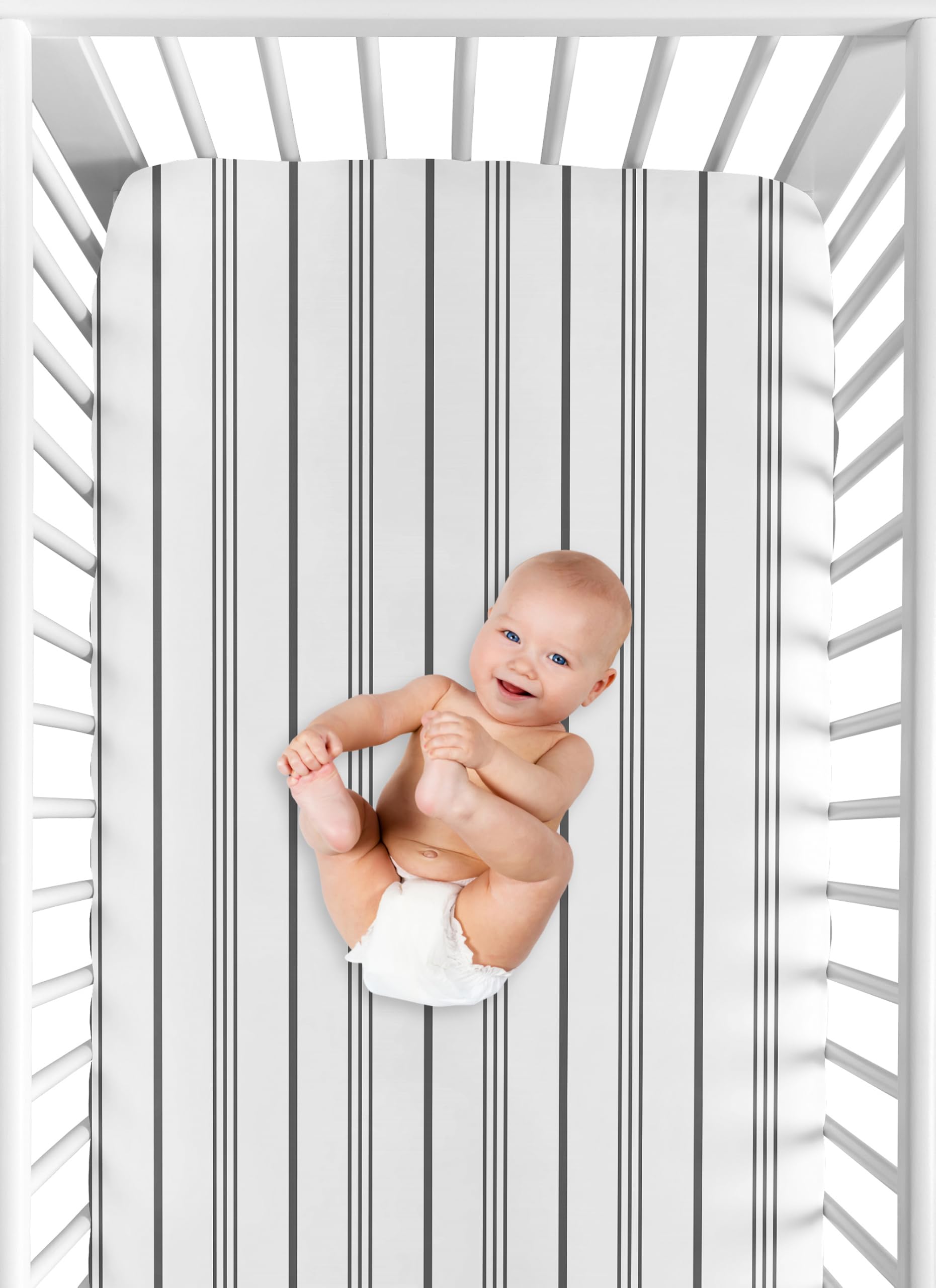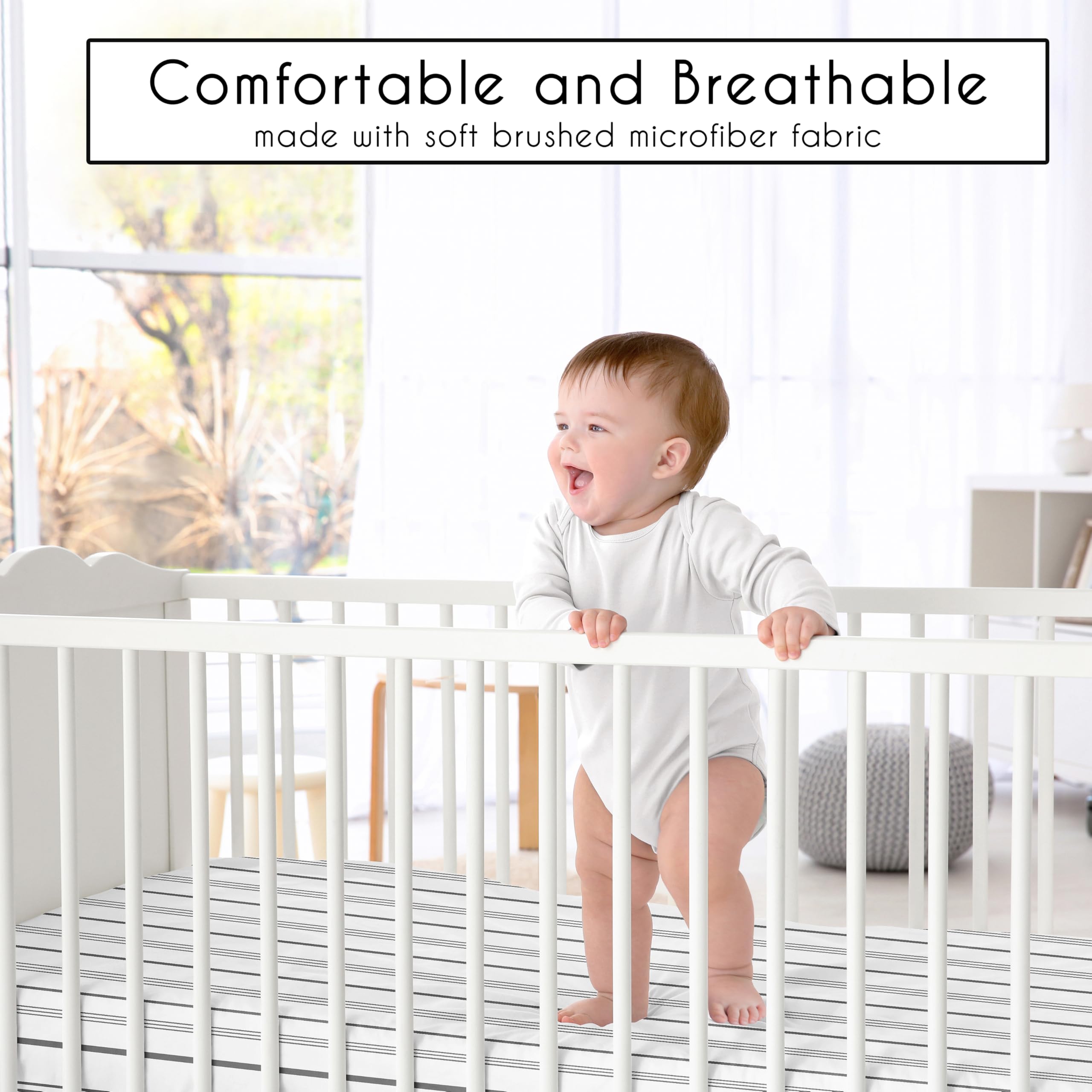 SNUG FIT: Includes (1) Fitted Crib Sheet 52in. x 28in. x 8in. Our newborn standard crib sheets fit snugly, with premium elastic sewn around the entire bottom edge for a secure fit on most standard sized cribs and toddler beds, to reduce shifting and bunching. This brushed microfiber crib sheet features an exclusive versatile design of a trendy and timeless classic yet modern, minimalist, geometric grey and white stripe print and is gentle on delicate skin to foster a soothing sleep environment.