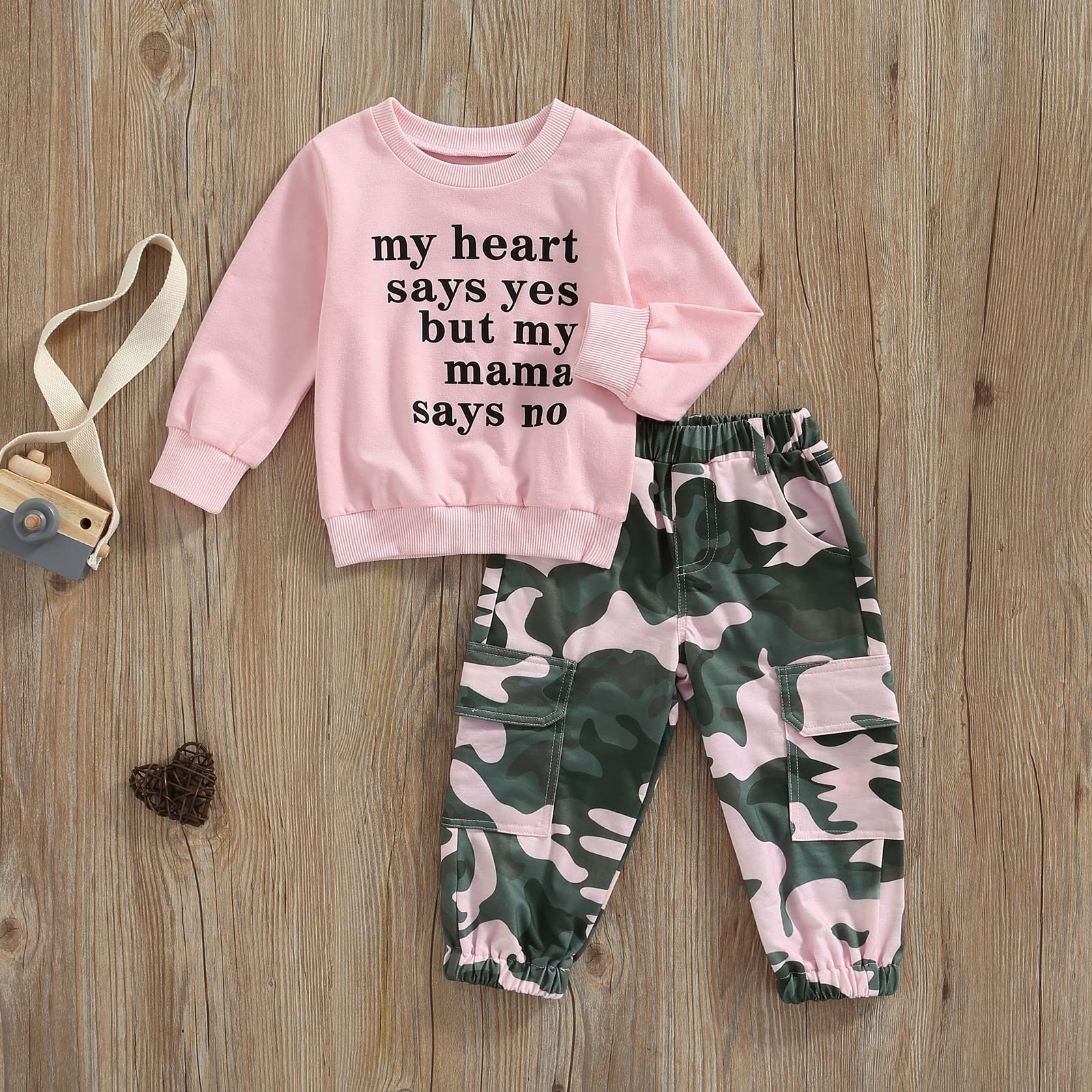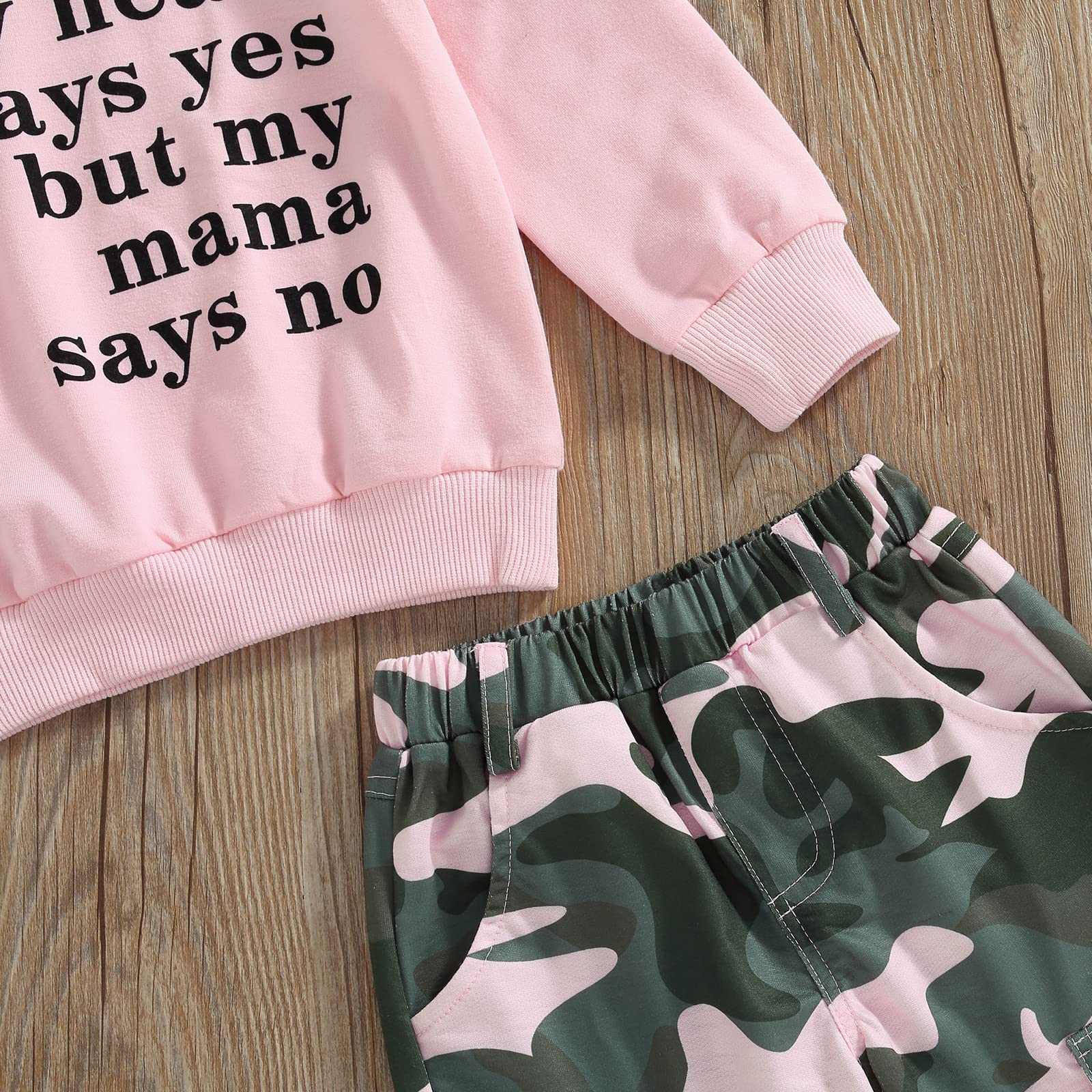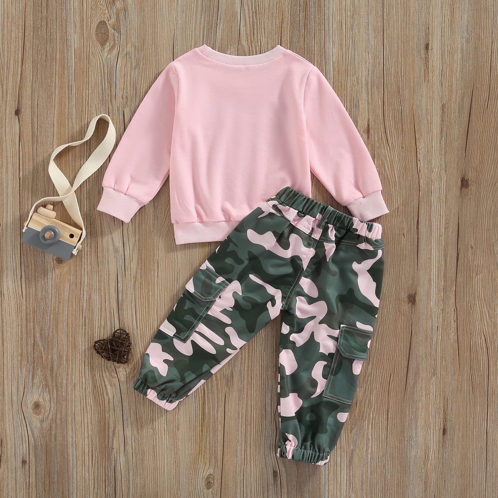 ♥Design: Baby girl fall outfits, pullover sweatshirt features letter print, long sleeves and a round neck. Trousers feature camouflage print and pockets.