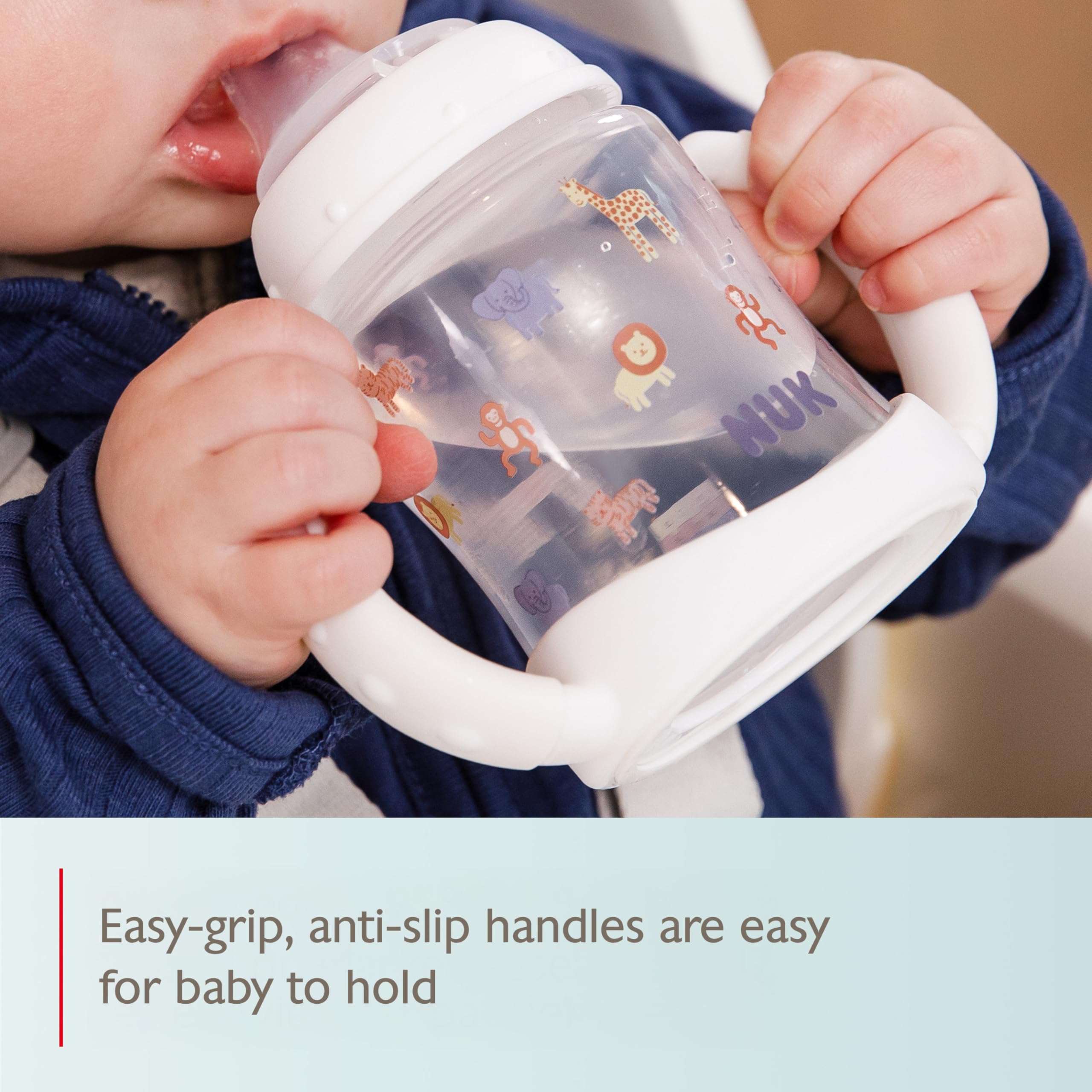 The NUK Learner Cup easily promotes baby’s transition from breast or bottle to sippy cup. This learner cup features a spill-proof soft spout that is gentle on teeth and gums, and it includes an air vent that helps reduce swallowed air. The cup also comes with easy-to-grip, removable handles that your growing child will love. NUK Learner Cups are BPA-free and dishwasher-safe. Our 5-oz. learner cups are recommended for ages 6 months and older.