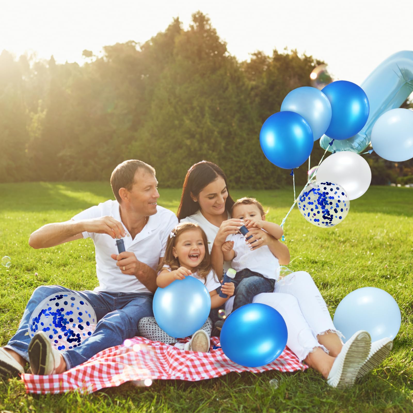 【Easy To Use】White and blue latex balloons and confetti balloons can be filled with air, helium and even water. Please do not over inflate the balloons to avoid bursting. If you have any questions about our balloon set, please contact us at once .