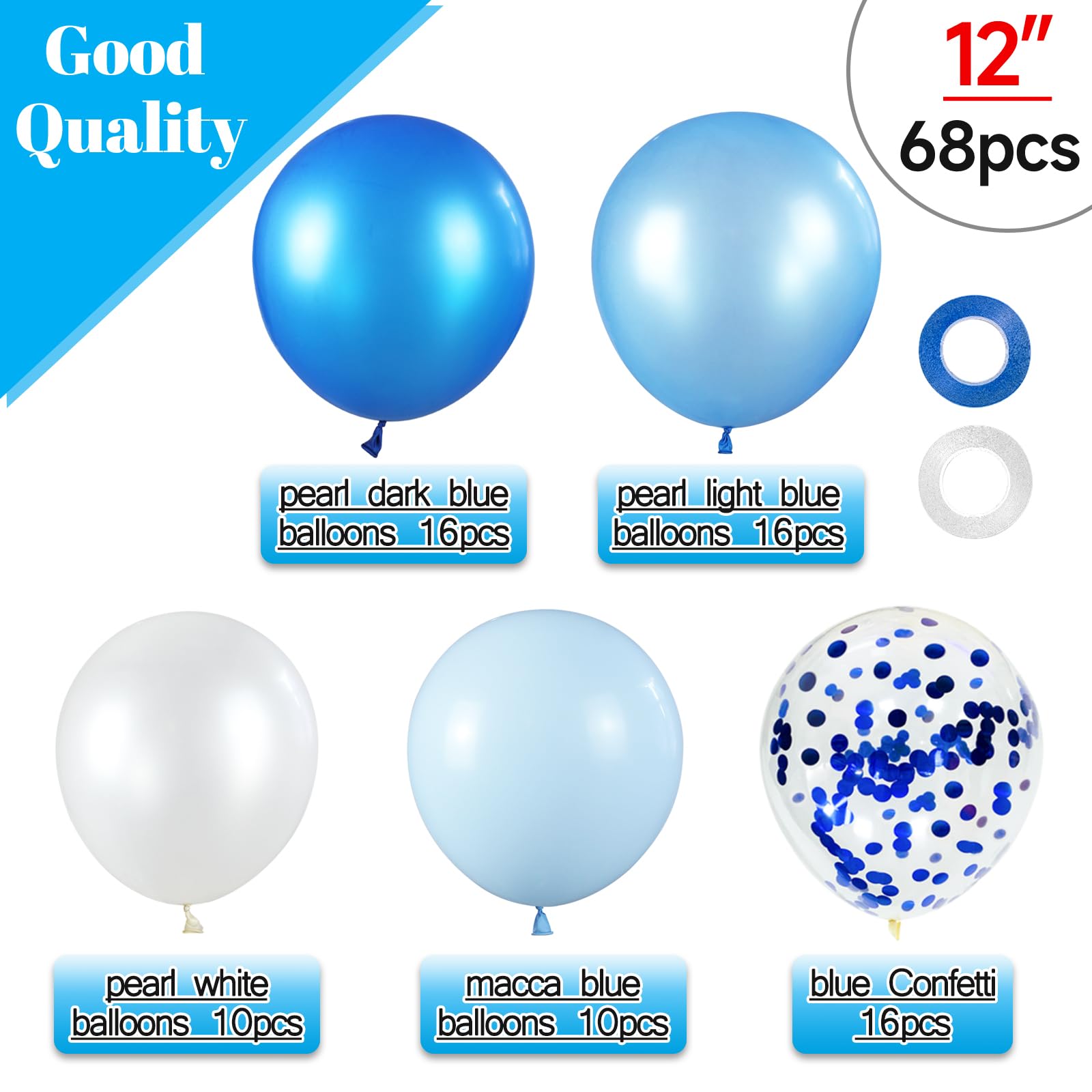 【White and Blue Balloons Packing】 This balloon kit includes 16pcs pearl dark blue balloons, 16pcs pearl light blue balloons, 10pcs pearl white balloons, 10 pcs baby blue balloons, and 16pcs blue confetti balloons, 2 rolls ribbons. All the balloon size is about 12 inches after inflation.
