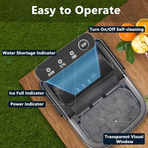 This mini ice maker boasts fast, low-noise performance, making 9 cubes in 6-13 mins (up to 26 lbs/24h) with <35dB operation. It offers S/L ice sizes: S for seafood/beer freshness, L for quick beverage cooling. Weighing 14.08 lbs (D11.30×W8.66×H11.42 inches) with a handle, it’s portable for home, office, camping. It has a self-clean function (hold ON/OFF 5s, 30mins) and removable top; clean monthly. Easy to use: add water, press ON, select size; indicators for low water/full ice.