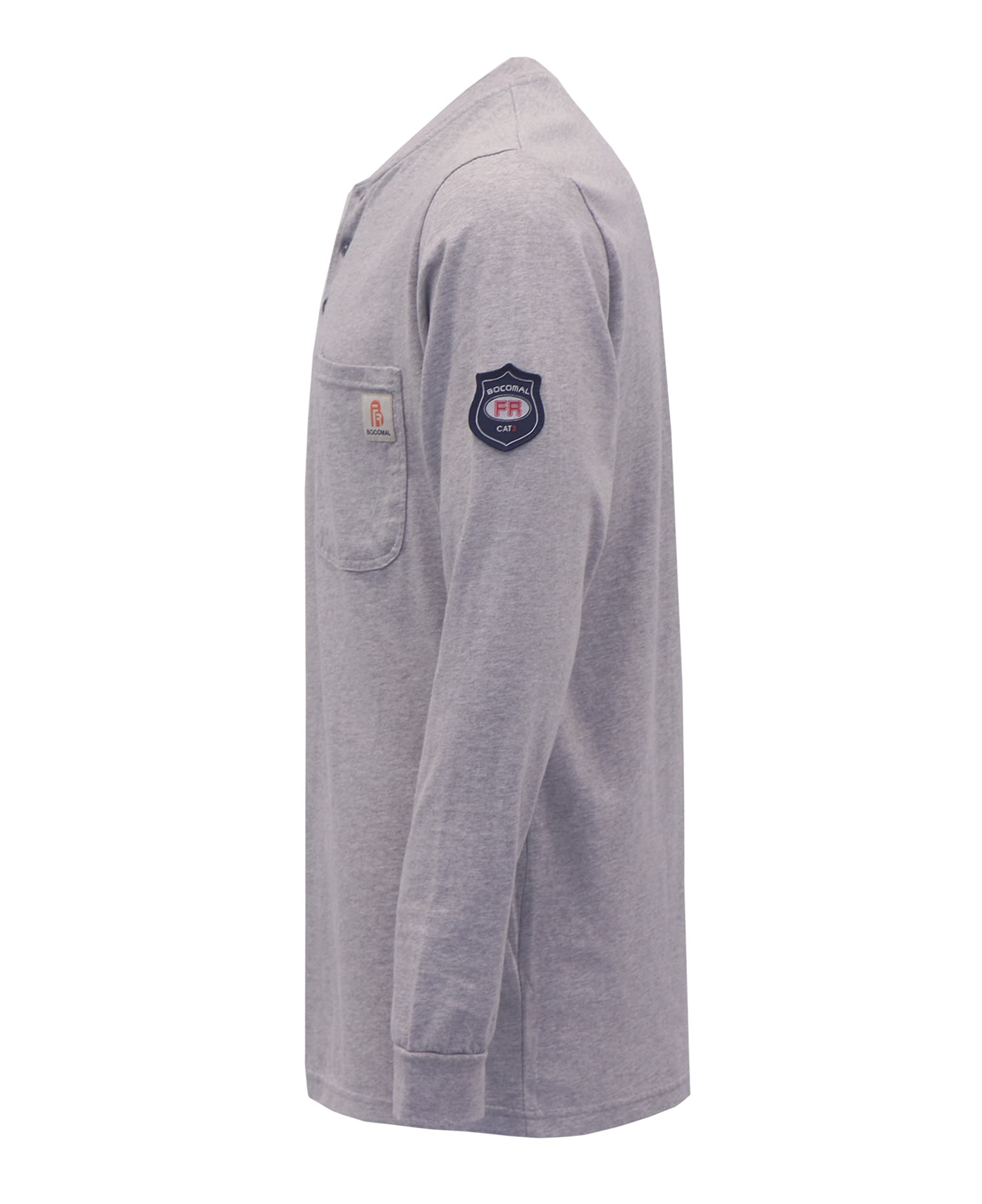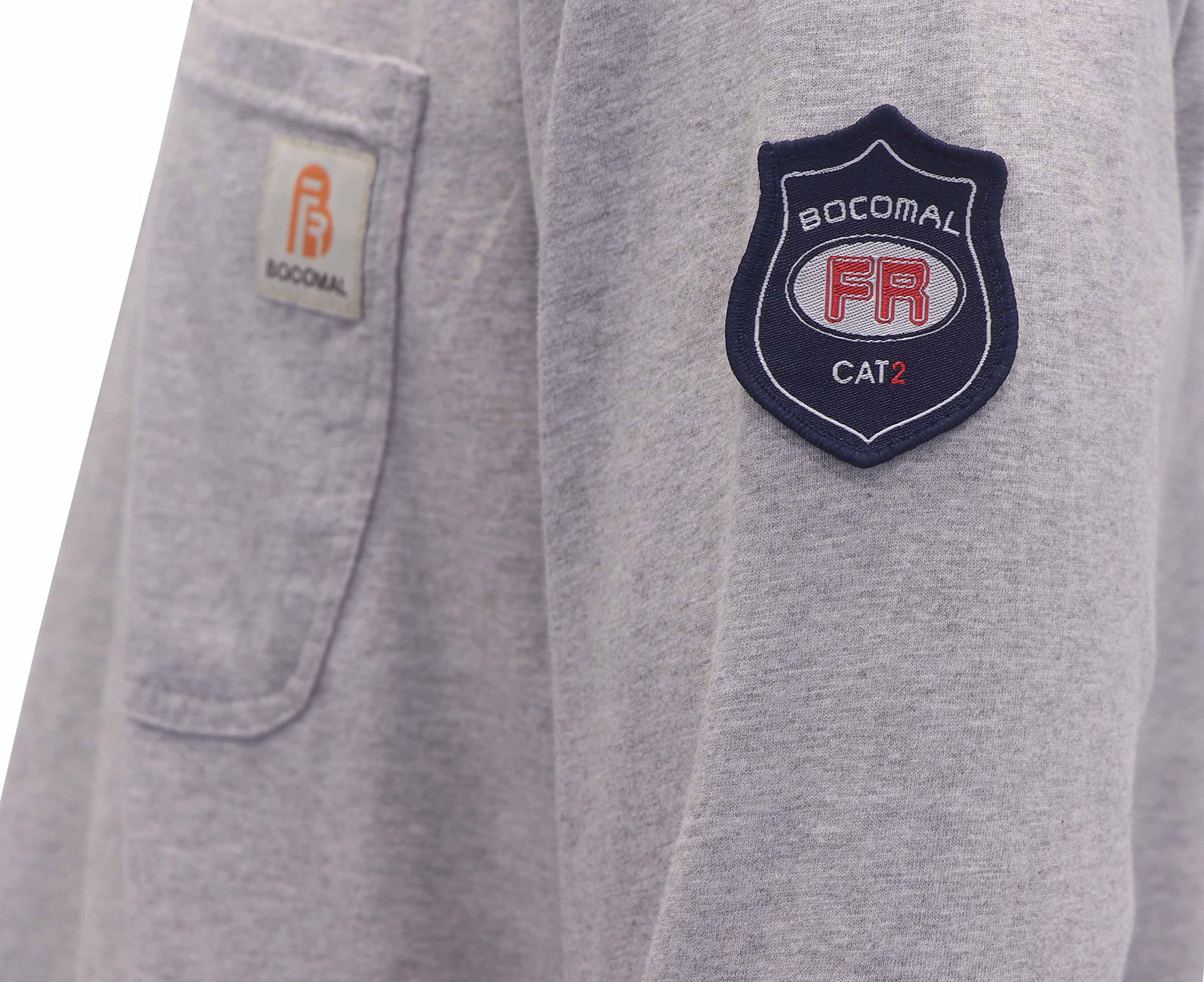 FR MATRIALS:5.5OZ Cotton Knit FR Treated,FR Buttons,FR Sewing Threads!Clear FR Tag on arms and bottom front.More FR info On Neck Tag About UL Certification.We Attached A Small Sample Inside Package For Cunstomers Simple FR Try