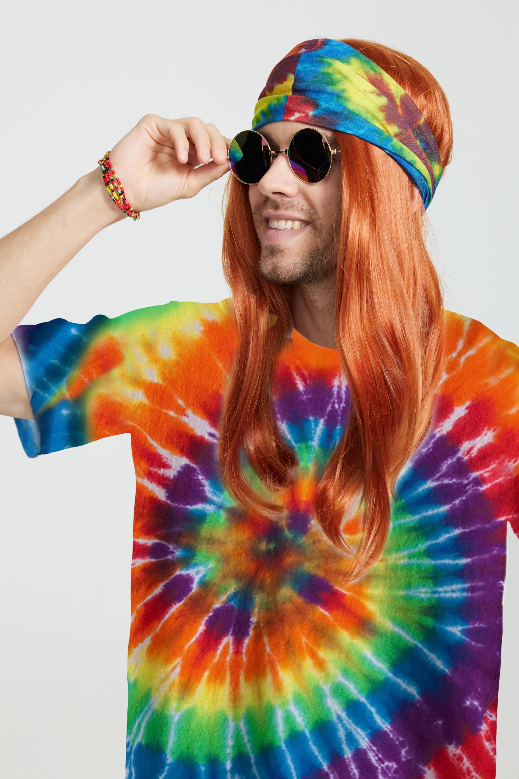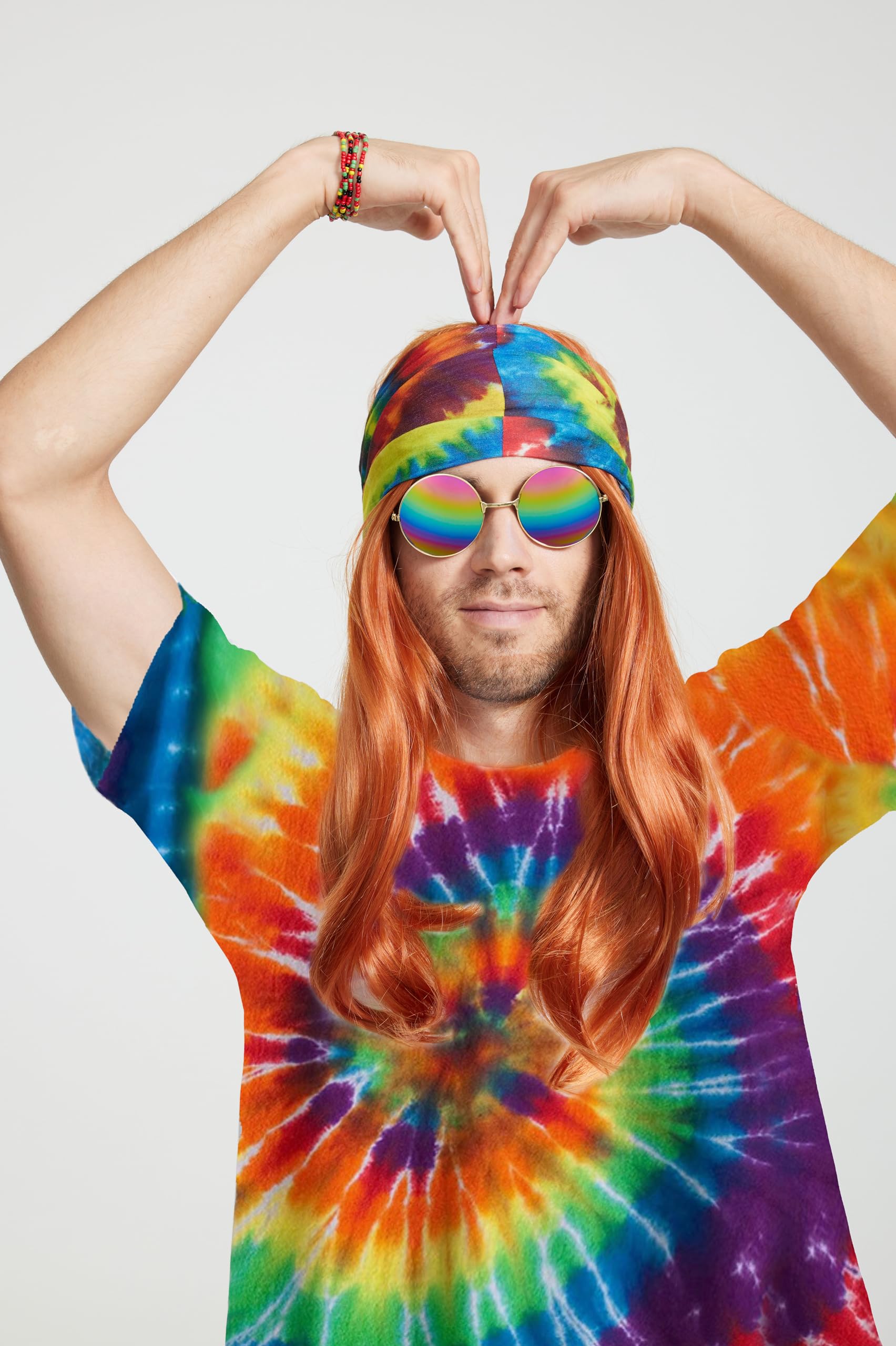 The hippie costume accessories set includes: 1* colorful hippie T-shirt, 1*peace sign necklace, 1*tie dry band, 1* string beads (can be used as bracelet or necklace) and 1 * rainbow sunglasses. You will get 5 pieces what you see in the image.