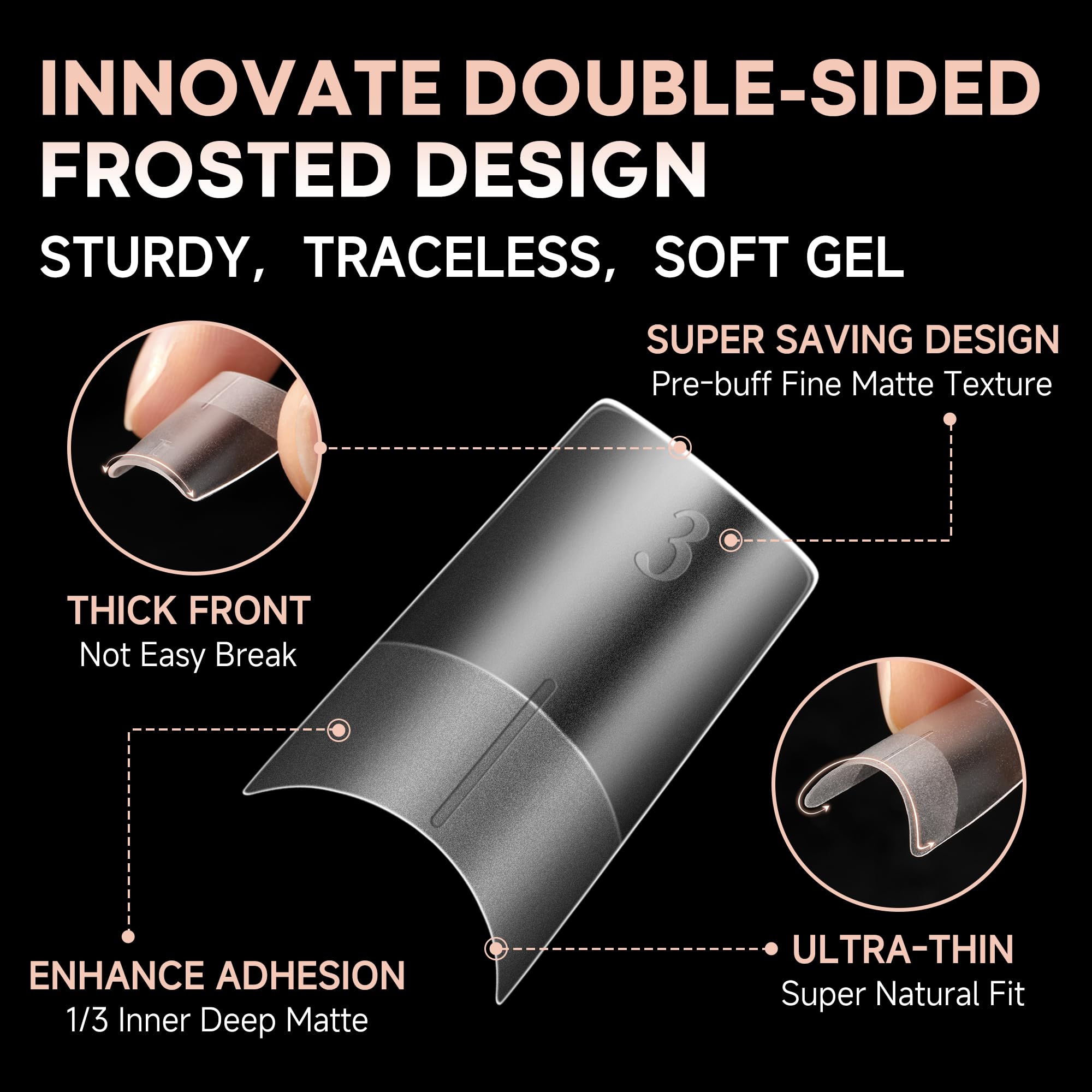 💖NEWLY DOUBLE SIDE MATTE TEXTURE-Our medium square gel nail tips upgraded double-sided frosted design. The surface pre-buff with fine matte for applying base coat gives a glossy look. And 1/3 inner pre-buff with deep matte for better adhesive nails. "Thick Front, Ultra-thin Back" design benefit of break-resistant and ultra fit. Let you enjoy this unprecedented professional nail salon enjoyment!