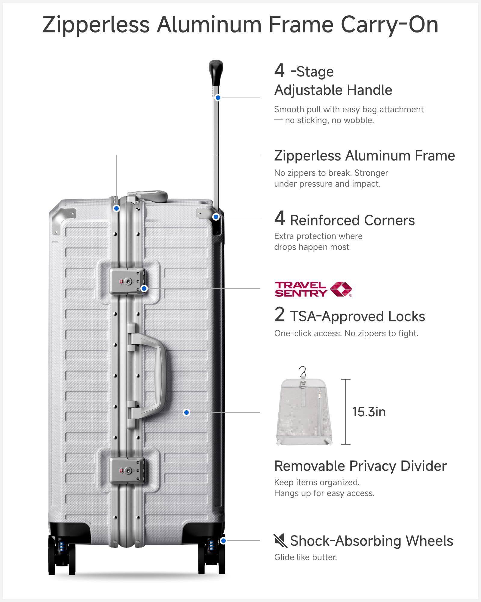 Convenient TSA Latches: Our no zipper luggage features advanced TSA latches for quick, zipperless access. One-touch unlocking simplifies security procedures. Breeze through airport security and avoid zipper hassles, making your travel experience more efficient and enjoyable.
