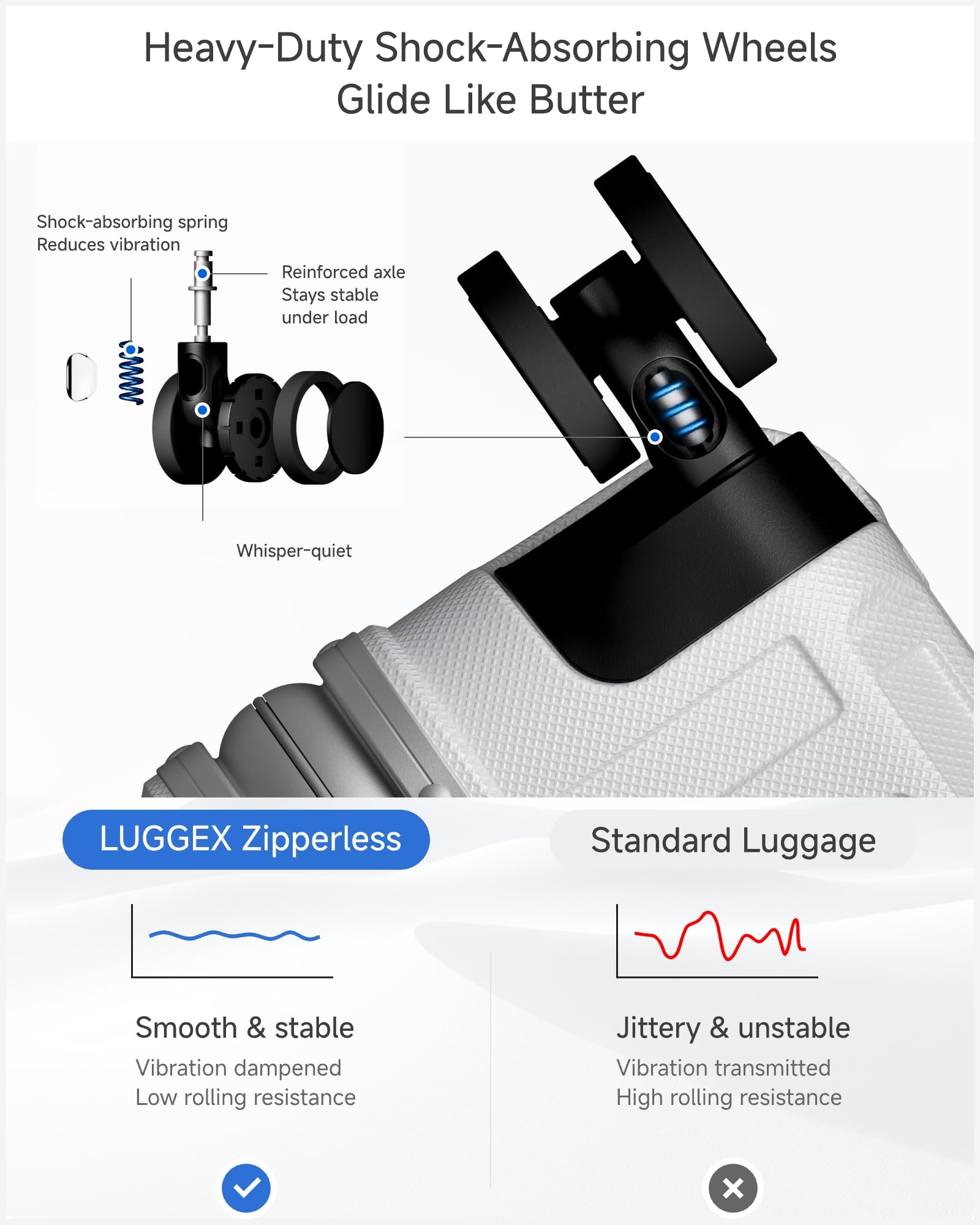 Smooth Rolling Performance: Featuring wheels with built-in springs, our carry-on luggage minimizes vibrations and increases durability. The spring system provides a more stable roll. Glide easily over different surfaces with less effort and greater stability, making your journey more pleasant.