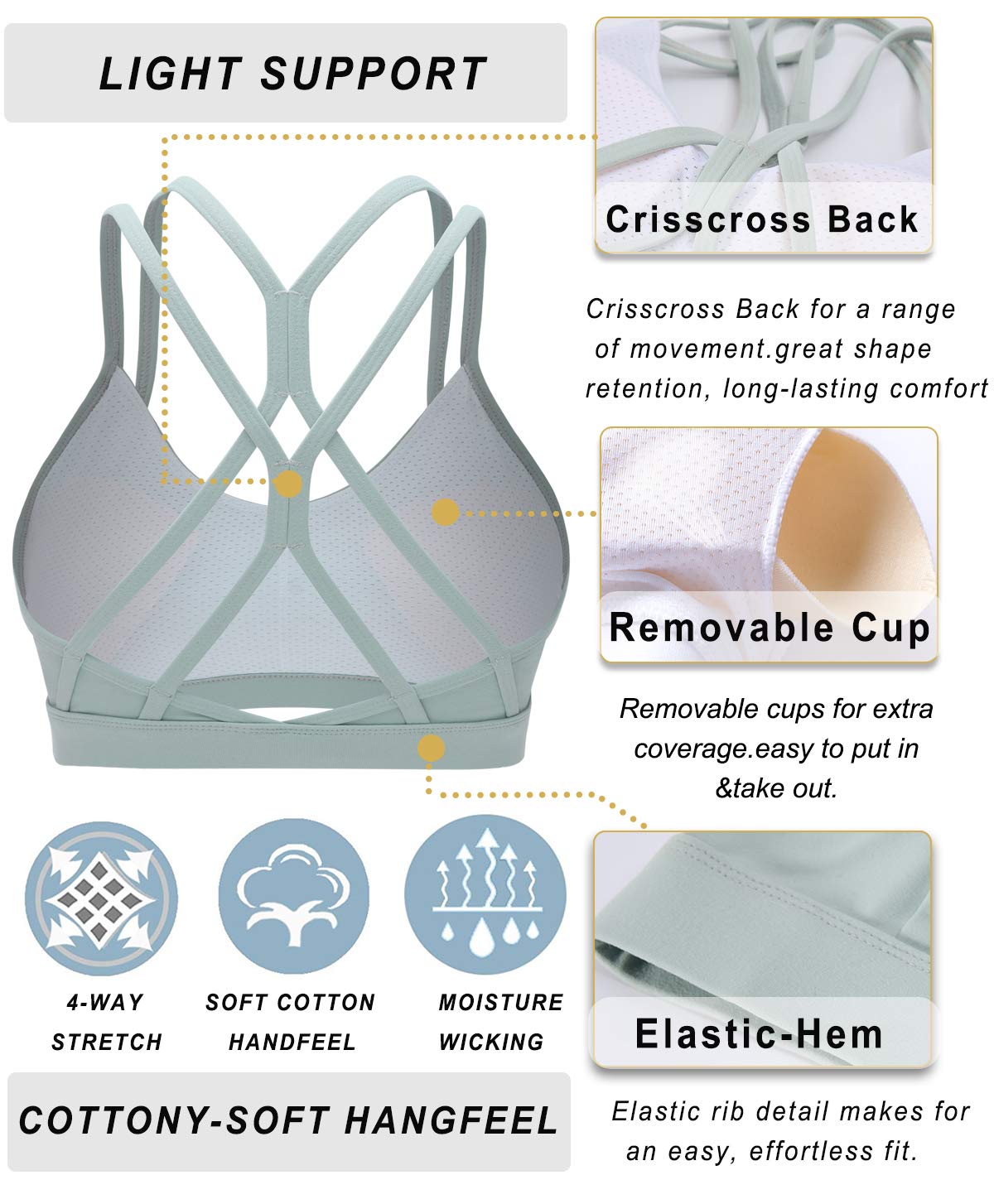 WHY WE MADE THIS: We designed this bra with a strappy, crisscross back for a range of movement. Made with moisture wicking fabric that's sweat-wicking and four-way stretch that offers great support and coverage with a cool, give you smooth COTTONY-SOFT HANGFEEL, great shape retention, long-lasting comfort—if you want it.