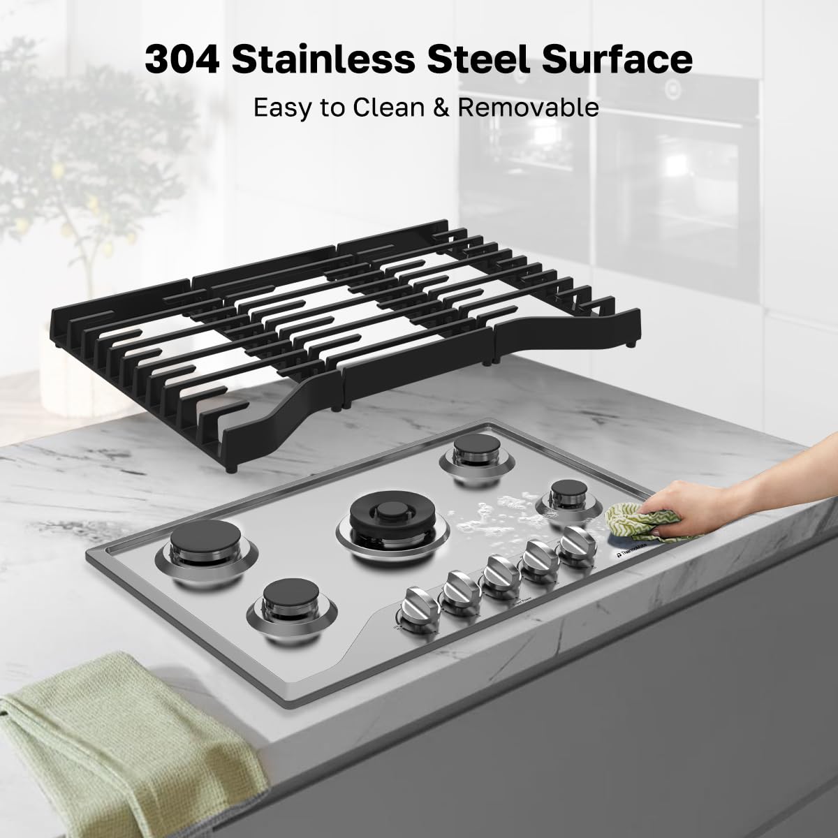 1 Minute to Clean: 0.03-inch #304 stainless steel integrally molded panel and removable dishwasher-safe cast iron grates designed for effortless cleanup, resist stains and discoloration. Sealed burners keep the food residue away.