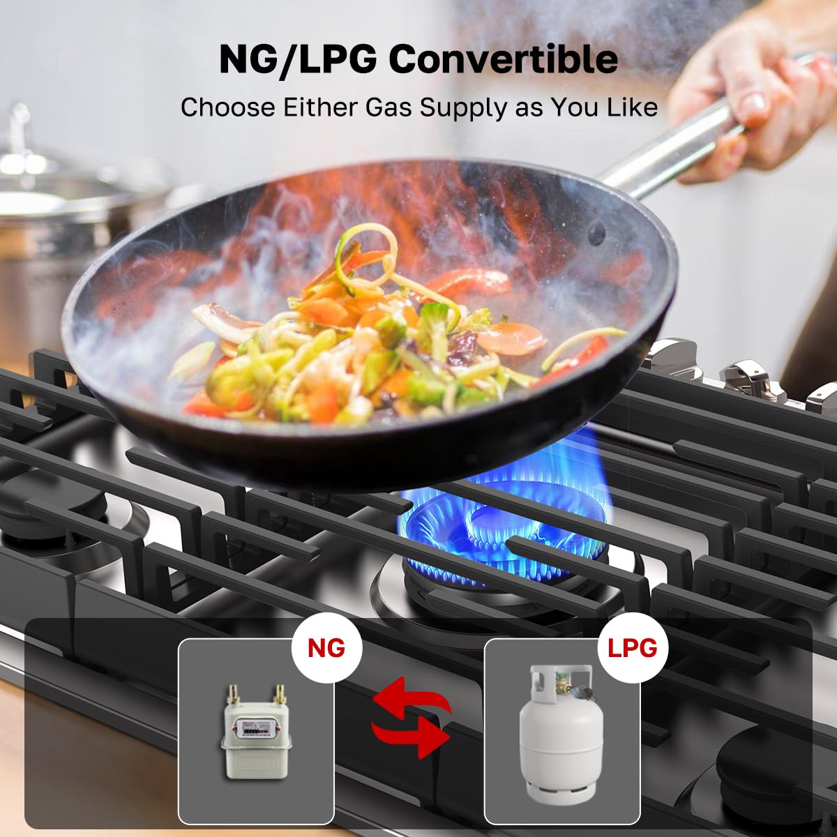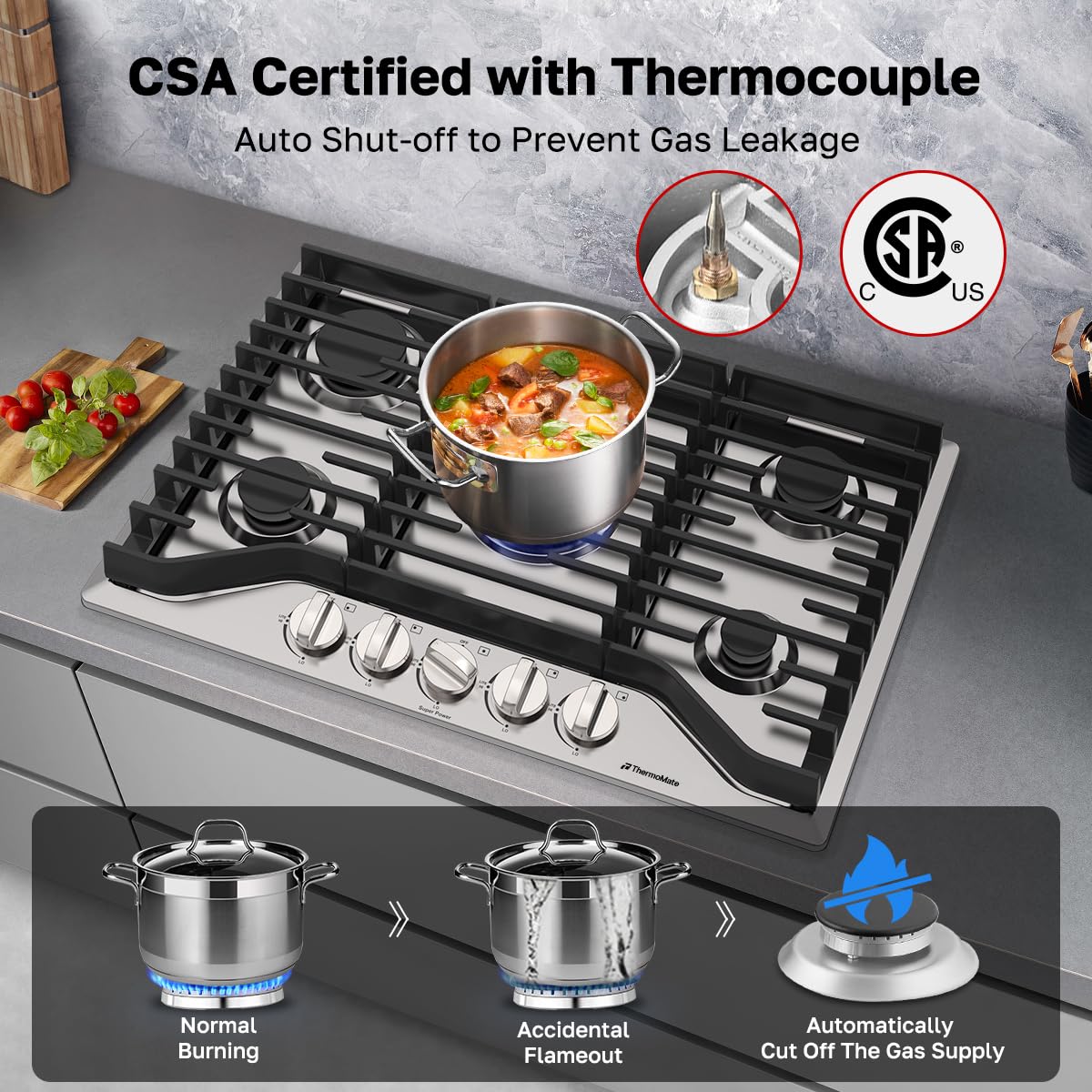 thermocouple&CSA: This 30 inch NG/LPG gas stove-top has CSA certified gas pressure regulator, equipped with a thermocouple flameout protection technology (FFD) automatically turning off gas when no flame is detected. Prevent accidental touch by children with ignition controlled by a push-type rotary switch.