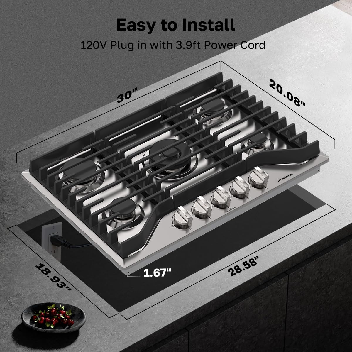 5 Minutes to Install: Please verify the gas hob is the right size for you. Product size: 30” W × 20.08” D × 1.67” H, Cut out size: 25.58” W × 19.13” D. 120V AC pulse ignition with 3.9 feet (1.2 m) power cord for quick connection.