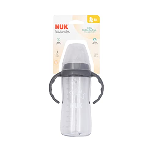 The NUK Large Learner Cup easily promotes baby’s transition from breast or bottle to sippy cup. This large learner cup features a spill-proof, soft spout that is gentle on teeth and gums, and it includes an air vent that helps reduce swallowed air. The toddler cup also comes with easy-to-grip, removable handles that your growing child will love. NUK Large Learner Cups are made of crystal-clear Tritan® material, and are BPA-free and dishwasher-safe. Our 10-oz. learner cups are recommended for babies and toddlers 8 months and older.