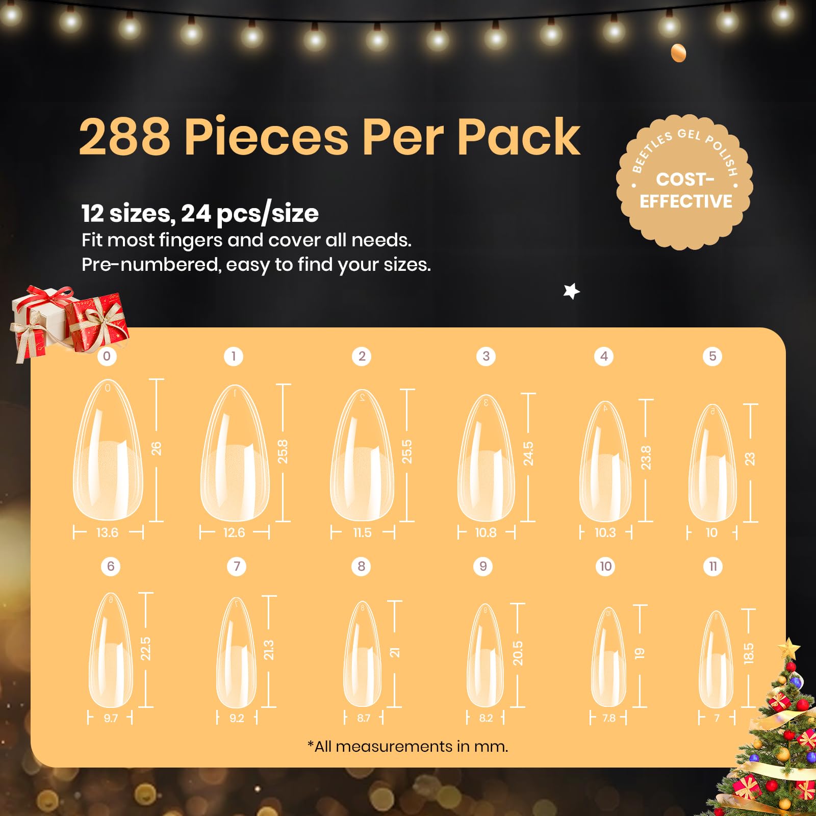 【Fit Nails Perfectly】:This 288 PCS false nail tips set comes in 12 sizes for effortless matching to each finger. Each nail tip in the transparent series features a thinner edge to fit your natural nails. The pre-filed design reduces the need for extensive filing.Beetles nail tips offer a more natural appearance, resembling nails that have grown out naturally.