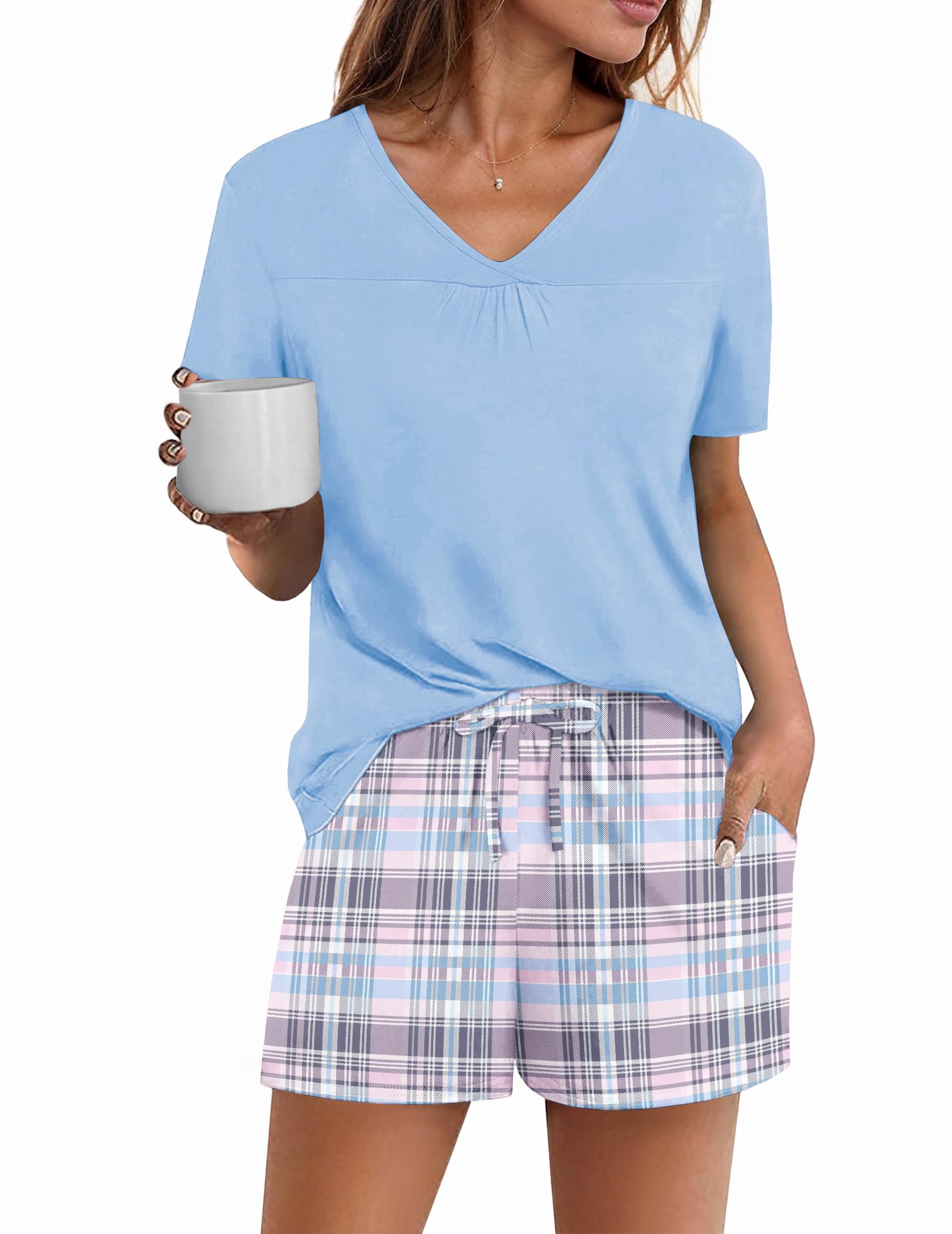 This soft pajama top features V neck, short sleeve, pleated front neckline,and the comfy modal pajama shorts is designed with elastic waist, drawstring and thigh-length