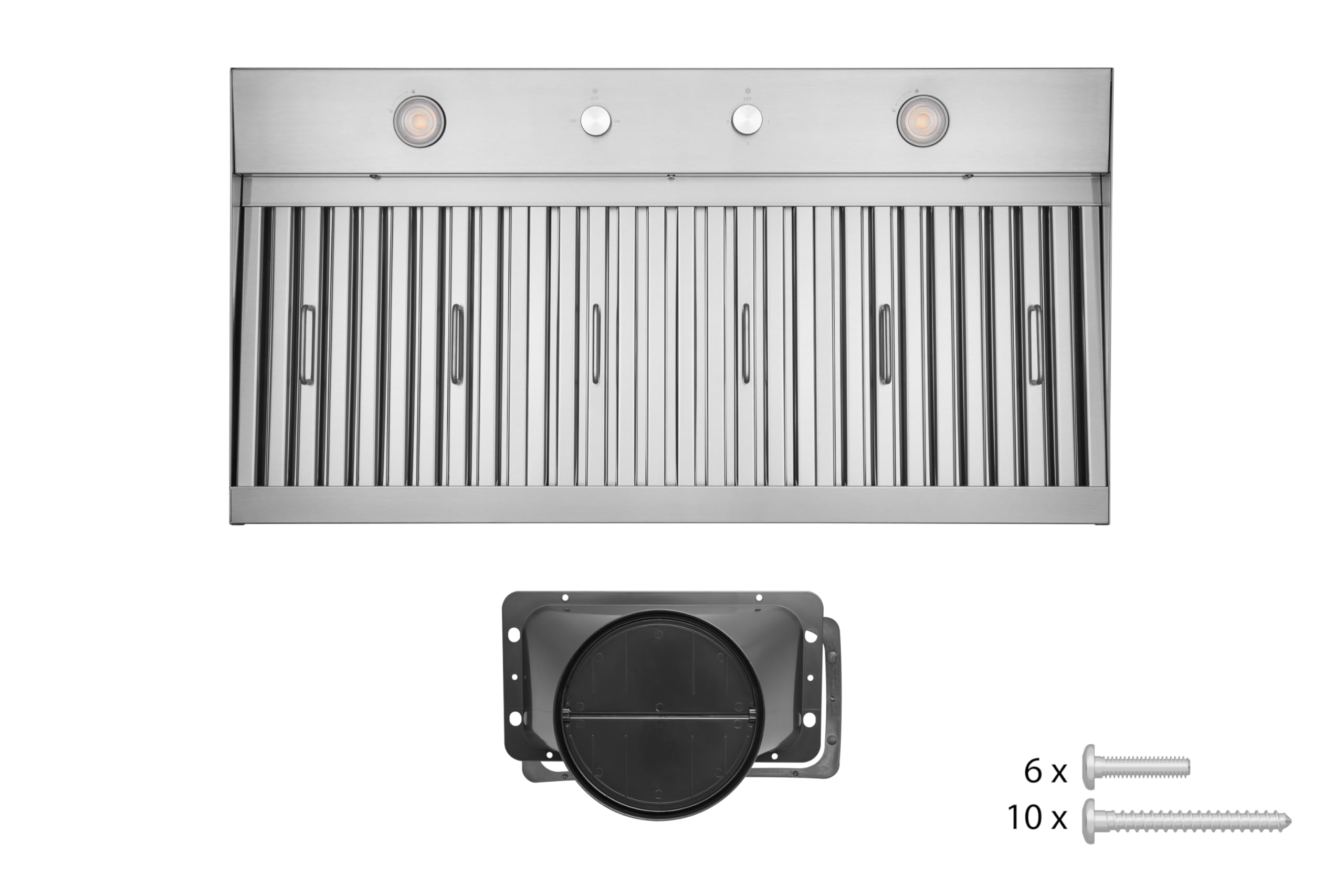 The overachiever your kitchen's been waiting for The Hauslane IN-R230SS-36 brings restaurant-quality ventilation to custom kitchen designs. This insert features professional flush-mount engineering that works perfectly with custom hood covers, giving you unlimited style options without sacrificing performance. The 390 CFM motor delivers professional-grade suction power while the uniquely designed duct system keeps noise levels conversation-friendly. Three speed settings give you precise control, whether you're gently simmering or searing at high heat. The flush-mount design sits seamlessly within your cabinet opening with no awkward lips or gaps. Two GU10 LED bulbs provide bright, energy-efficient lighting that is easily replaceable when needed. The dishwasher-safe baffle filters feature full-size handles for easy removal and grooves that trap all grease. The flush-mount design creates a seamless appearance within your cabinet opening. Convertible installation works with both ducted and ductless setups (CFI010 charcoal filters sold separately). Durable stainless steel construction resists fingerprints and maintains its appearance with minimal maintenance. Backed by a 2-year parts and labor warranty plus a lifetime motor warranty.