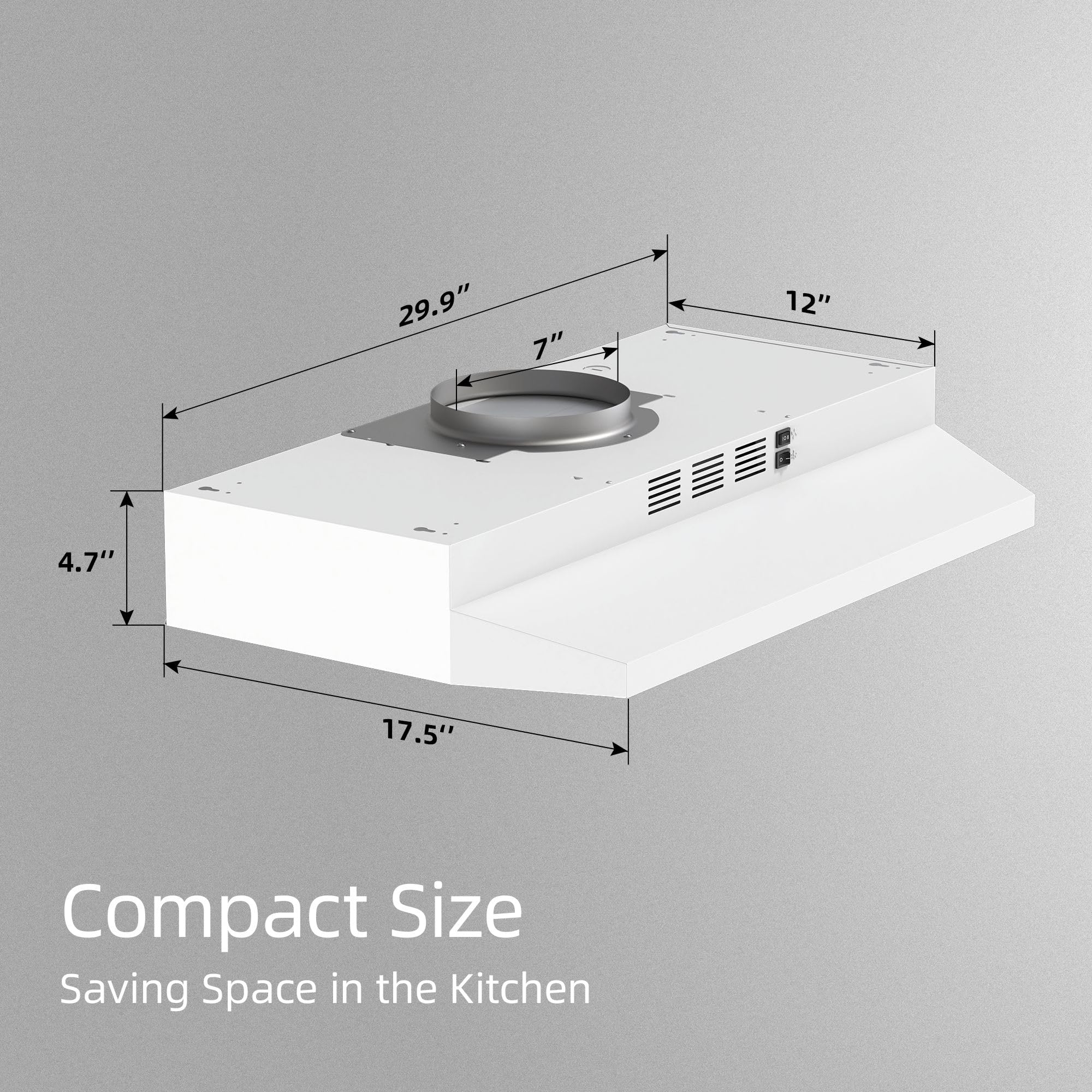 【Ultra Slim Design】Product Dimensions: 29.9" W×17.5" L×4.7"H, which is slimmer than most other range hoods.Our under cabinet range hood is designed for small kitchens.The compact size fits your cabinet perfectly and saves space.Perfect for condos and apartments.