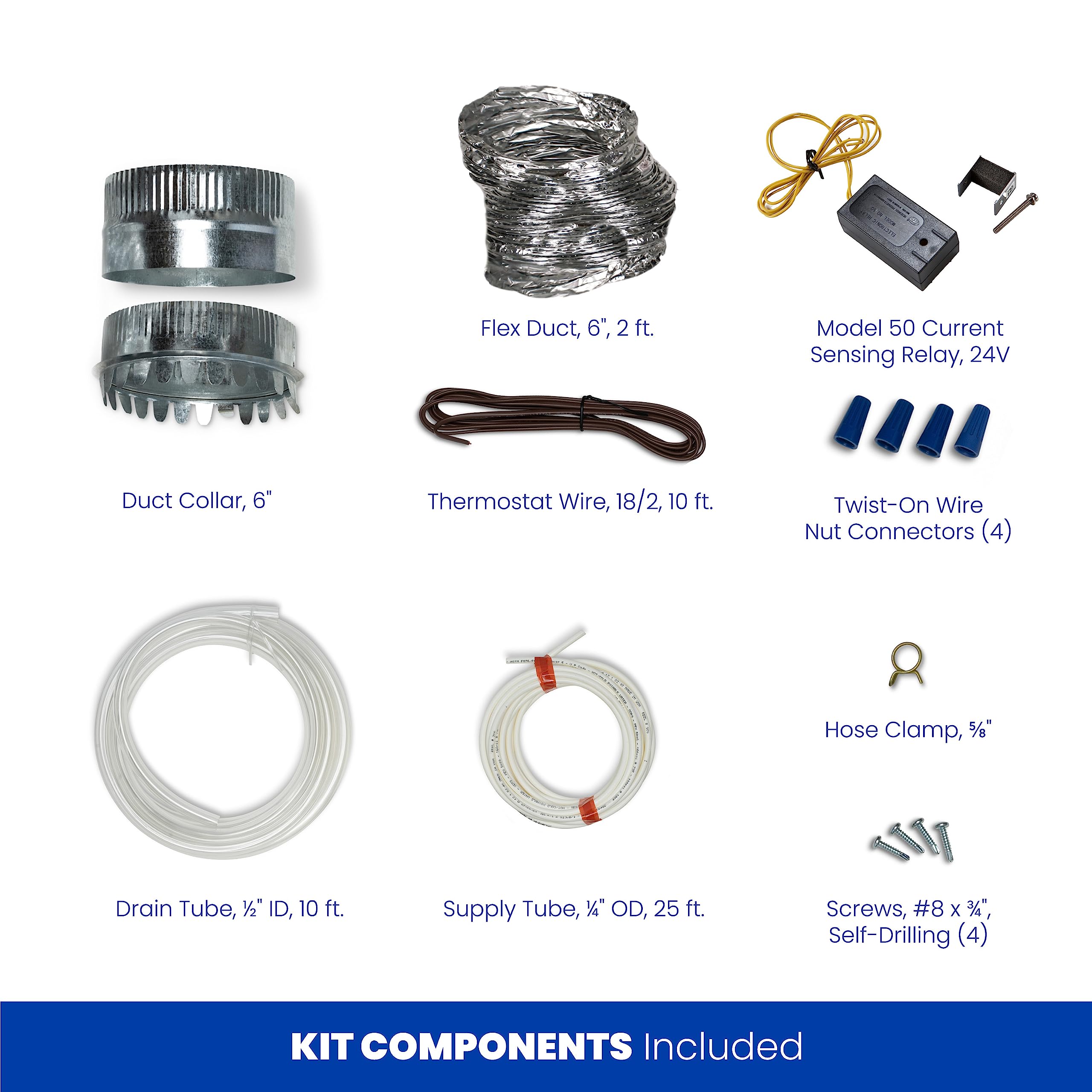 INCLUDES – 500M Whole-House Humidifier, Model 4655 Manual Humidistat, (1) genuine AprilAire 10 Water Panel, (4) 8 x 3/4 Mounting Screws, 6" Round Duct Collar, 6" Bypass Flex Duct (2 ft.), ¼" outside diameter (OD) Water Supply Tube (25 ft.), ½" interior diameter (ID) Drain Tube (10 ft.), ⅝" Hose Clamp, AprilAire Current Sensing Relay Model 50, 18/2 Thermostat Wire (10 ft.), and (4) Twist-On Wire Nut Connectors