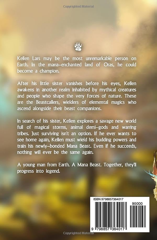Kellen Lars may be the most unremarkable person on Earth. In the mana-enchanted land of Oras, he could become a champion. After his little sister vanishes before his eyes, Kellen awakens in another realm inhabited by mythical creatures and people who shape the very forces of nature. These are the Beastcallers, wielders of elemental magics who ascend alongside their beast companions. In search of his sister, Kellen explores a savage new world full of magical storms, animal demi-gods and warring tribes. Just surviving isn't an option. If he ever wants to see home again, Kellen must wield his budding powers and train his newly bonded Mana Beast. Even if he succeeds, nothing will ever be the same again. A young man from Earth. A Mana Beast. Together, they'll progress into legend. Introducing a new progression fantasy adventure for fans of Cradle, Digimon, Avatar: The Last Airbender, and Frith Chronicles!