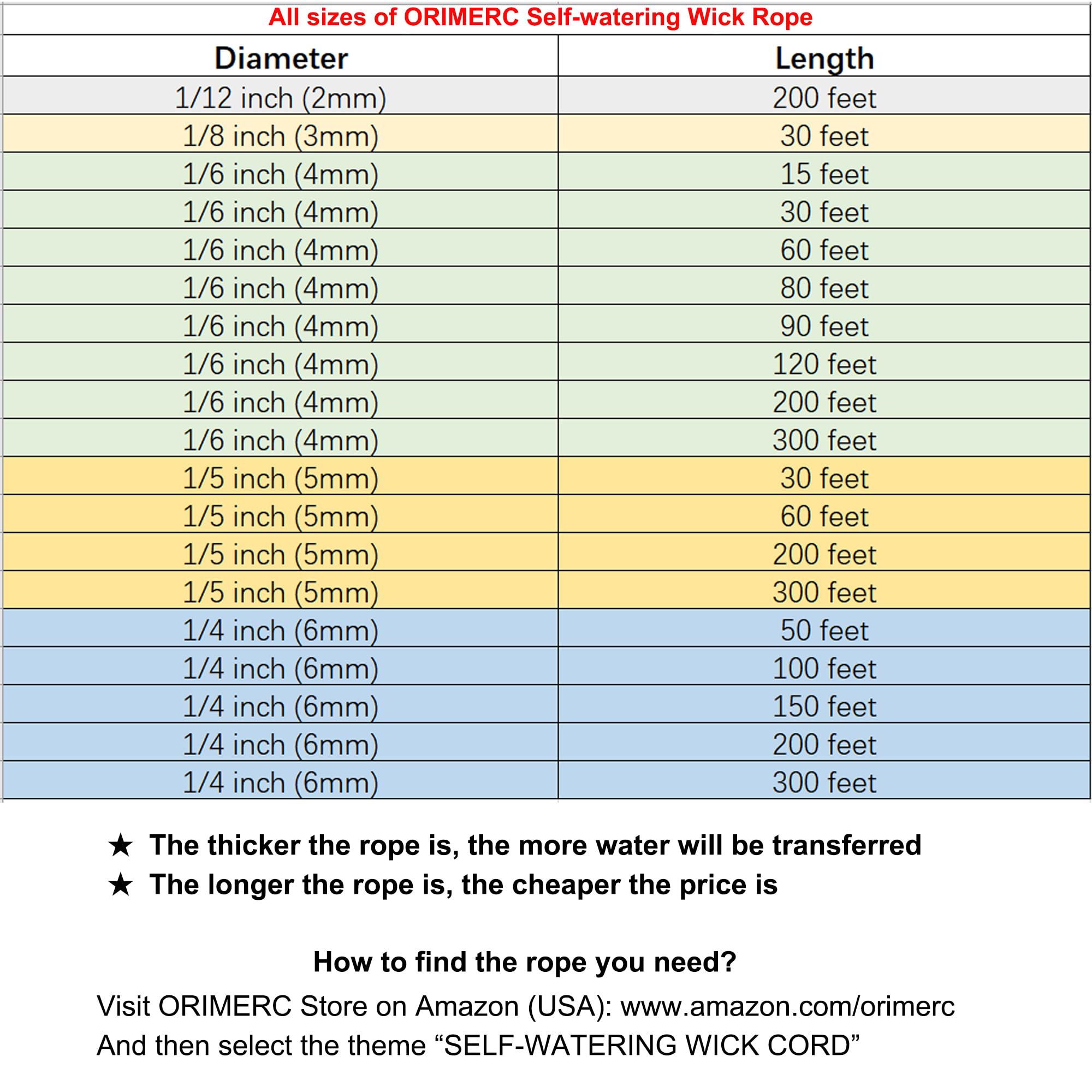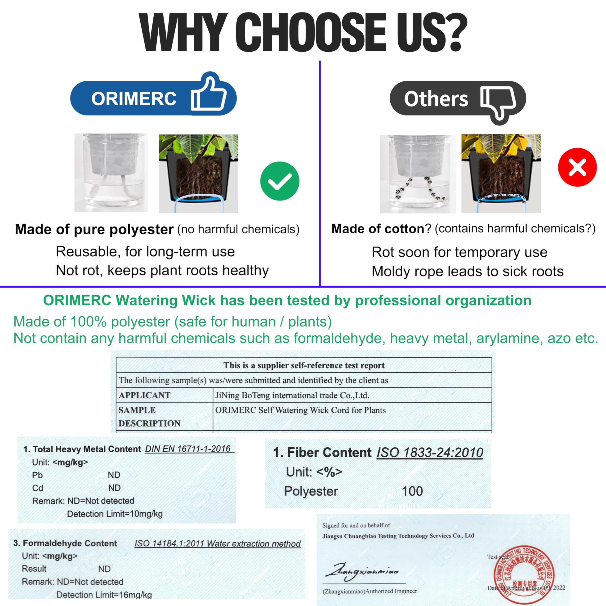 đăSize & Materială60 feet long, 1/6 inch diameter. Made of 100% polyester, Not rot or decay for long-term repeated use. Safe for human and plants, Not contain any harmful chemicals. ORIMERC self-watering string has been tested by professional organization: PH Value is 6.7, 100% polyester without any other material, does NOT contain any harmful chemicals such as formaldehyde, heavy metal, arylamine, azo etc.