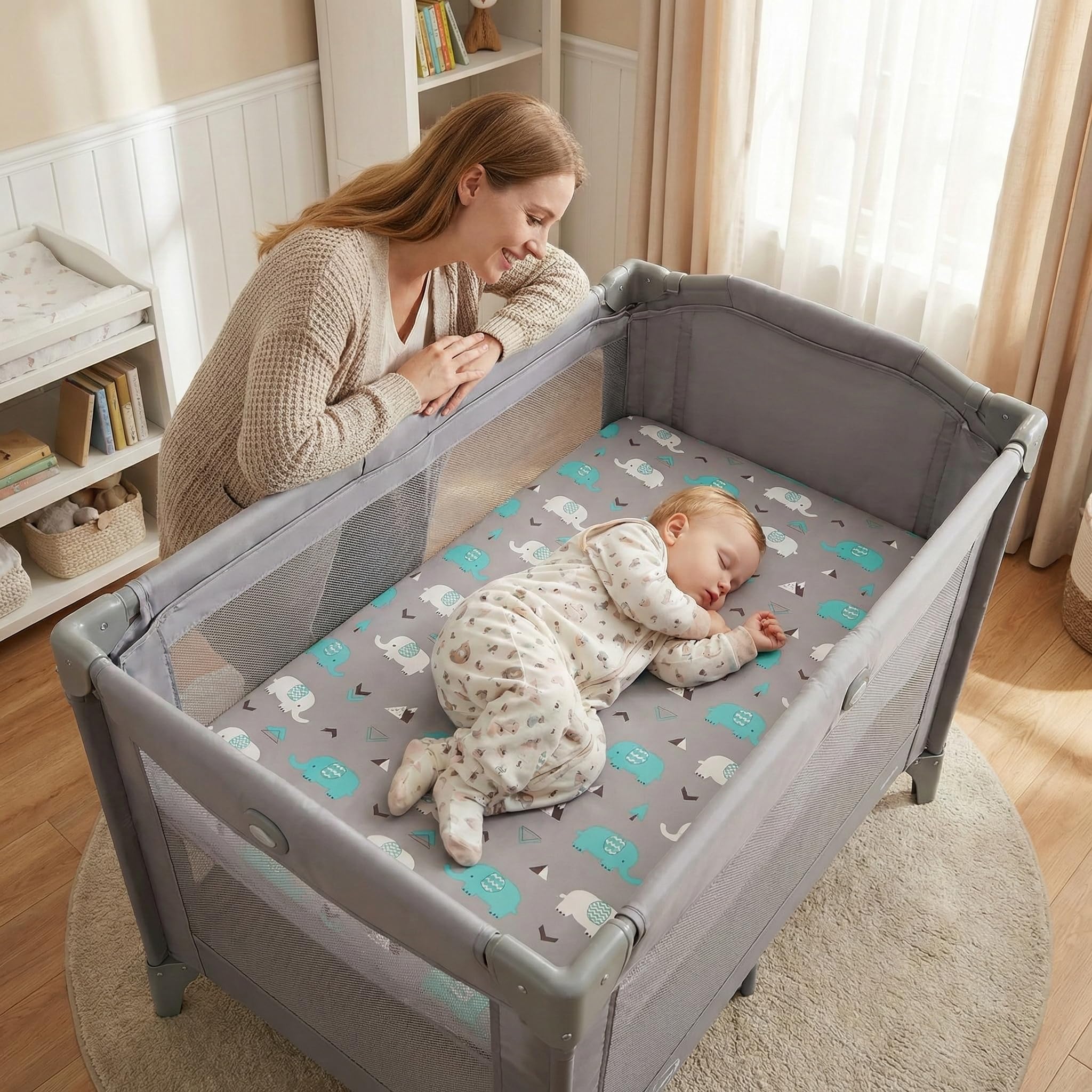 BREATHABLE MINI CRIB SHEETS FOR NEWBORN & INFANT: Crafted with breathable materials, these Pack and Play sheets help regulate your baby's temperature, ensuring a comfortable sleep all night long. Perfect for moms and parents who want a safe and eco-friendly option for their baby boy or girl, whether in the nursery, during travel, or at daycare.