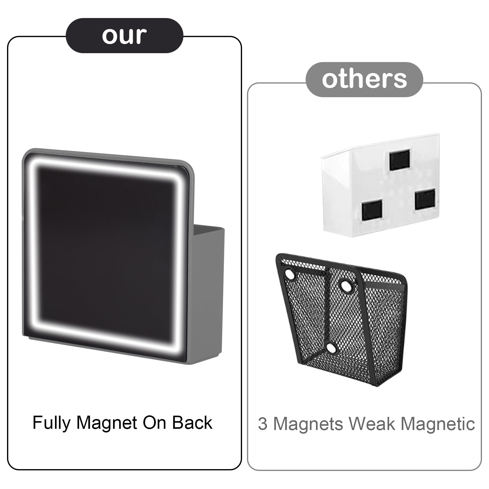Upgraded Magnetic Pen Holder:Magnetic marker holder adopts adjustable divider design,There are a movable divider and 3 slots inside. We come with 1 Piece two generous compartments storage holder and 1 Pieces small size holders,you can choose your storage Organizer of different sizes as you like.