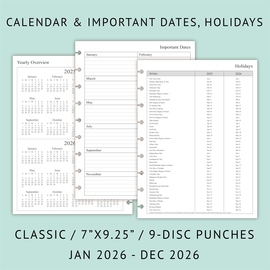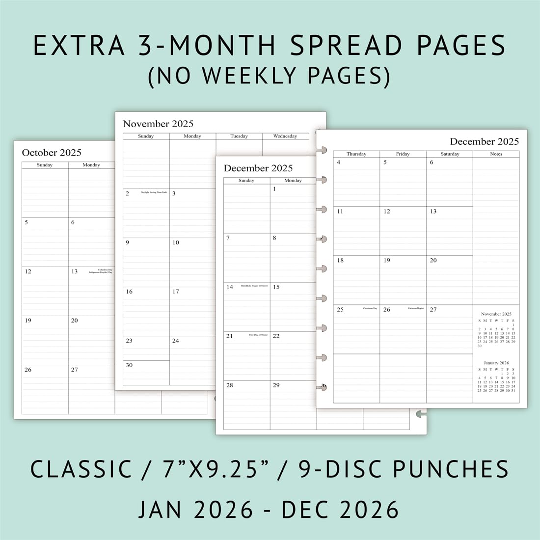Feature: 3 additional monthly spread pages for early planning (Oct 2025 to Dec 2025, no weekly pages), yearly calendar & holidays pages, contact and yearly goals, important dates, and notes pages