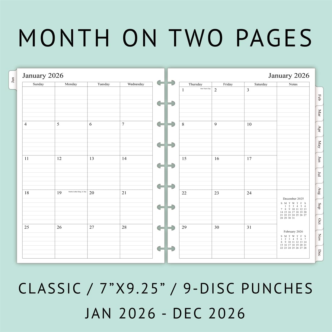 2 page monthly spread with ruled daily blocks, calendar & notes section, coated tabs for quick turning