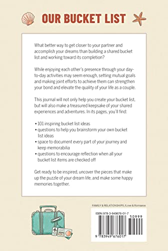 Create your shared bucket list together and record your adventures What better way to get closer to your partner and accomplish your dreams than building a shared bucket list and working toward its completion? This journal will not only help you create your bucket list together but will also make a treasured keepsake of your shared experiences and adventures. In its pages, you’ll find: 101 inspiring bucket list ideas―Pick the ones you like the most and add them to your list or alter them to suit your style and needs. Brainstorm questions―These questions will help you think up your own bucket list ideas. Compare your responses and let them inspire you in setting mutual goals. Space to document your journey―Jot down all of your bucket list items, journal about their fulfillment, and keep memorabilia to remind you of your shared adventures. Looking back questions―Questions to encourage reflection when all your bucket list items are checked off. Get ready to be inspired, uncover the pieces that make up the puzzle of your dream life, and make some happy memories together.