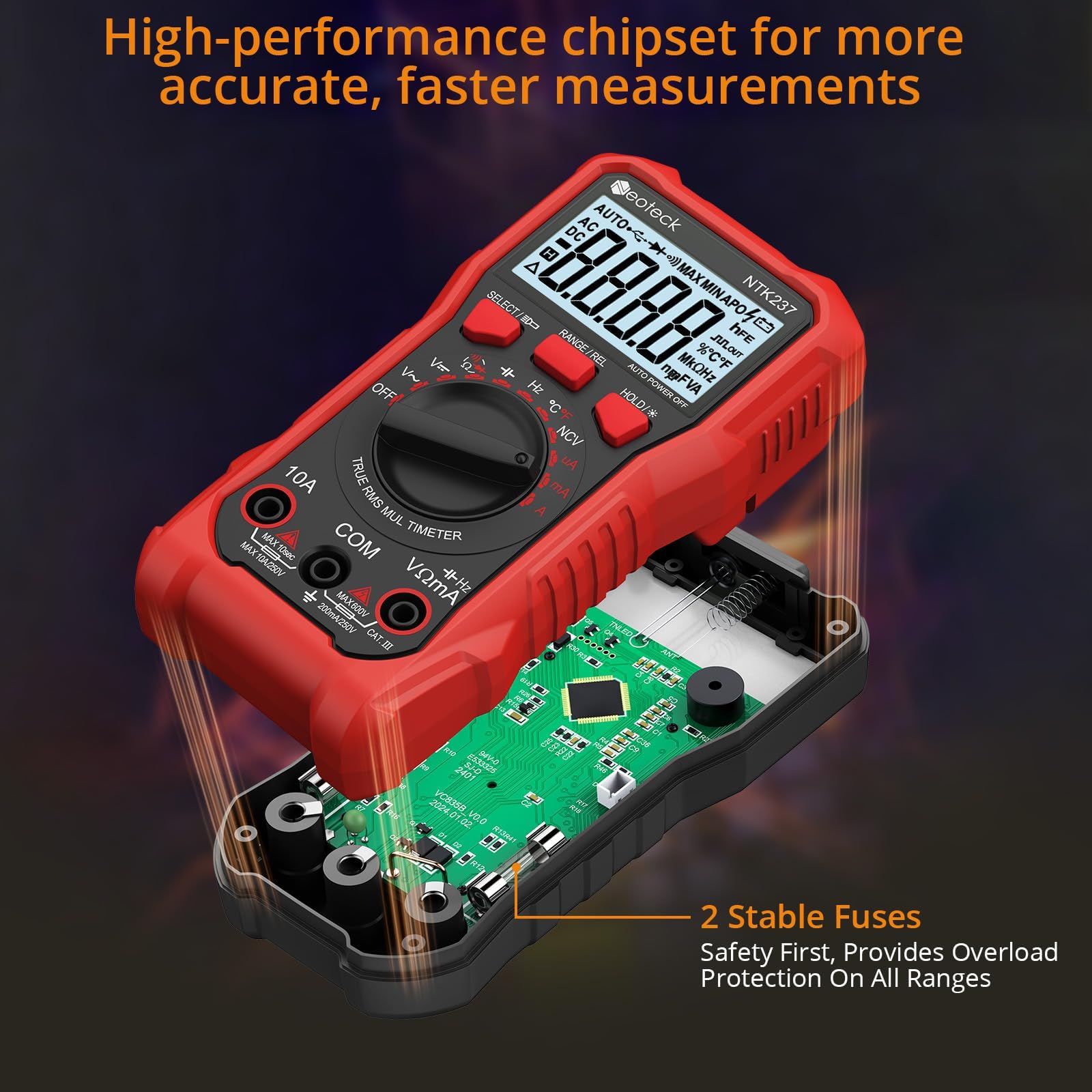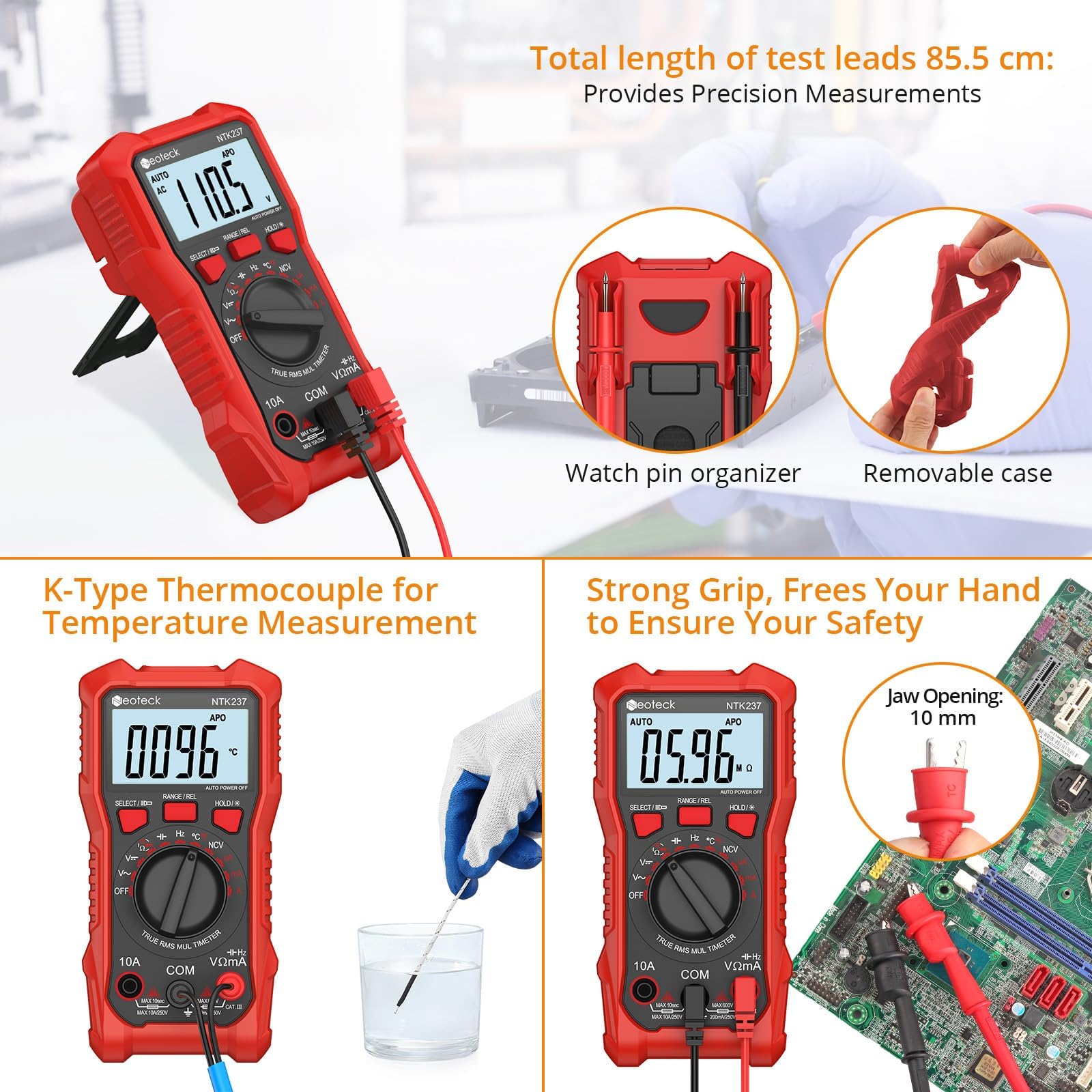 【Practical and Friendly Voltage Tester】Neoteck multimeter tester has the functions of switching manual/automatic range mode, data holding, low power indicator, automatic shutdown(After 15 Minutes without Operation), flashlight lighting, etc. These functions make it more intelligent and convenient to use.The digital multimeter has 2 pen holders on the back for easy placement and a screwdriver in the package for easy removal.