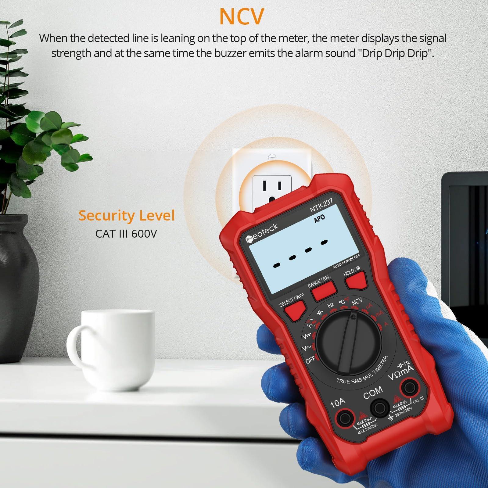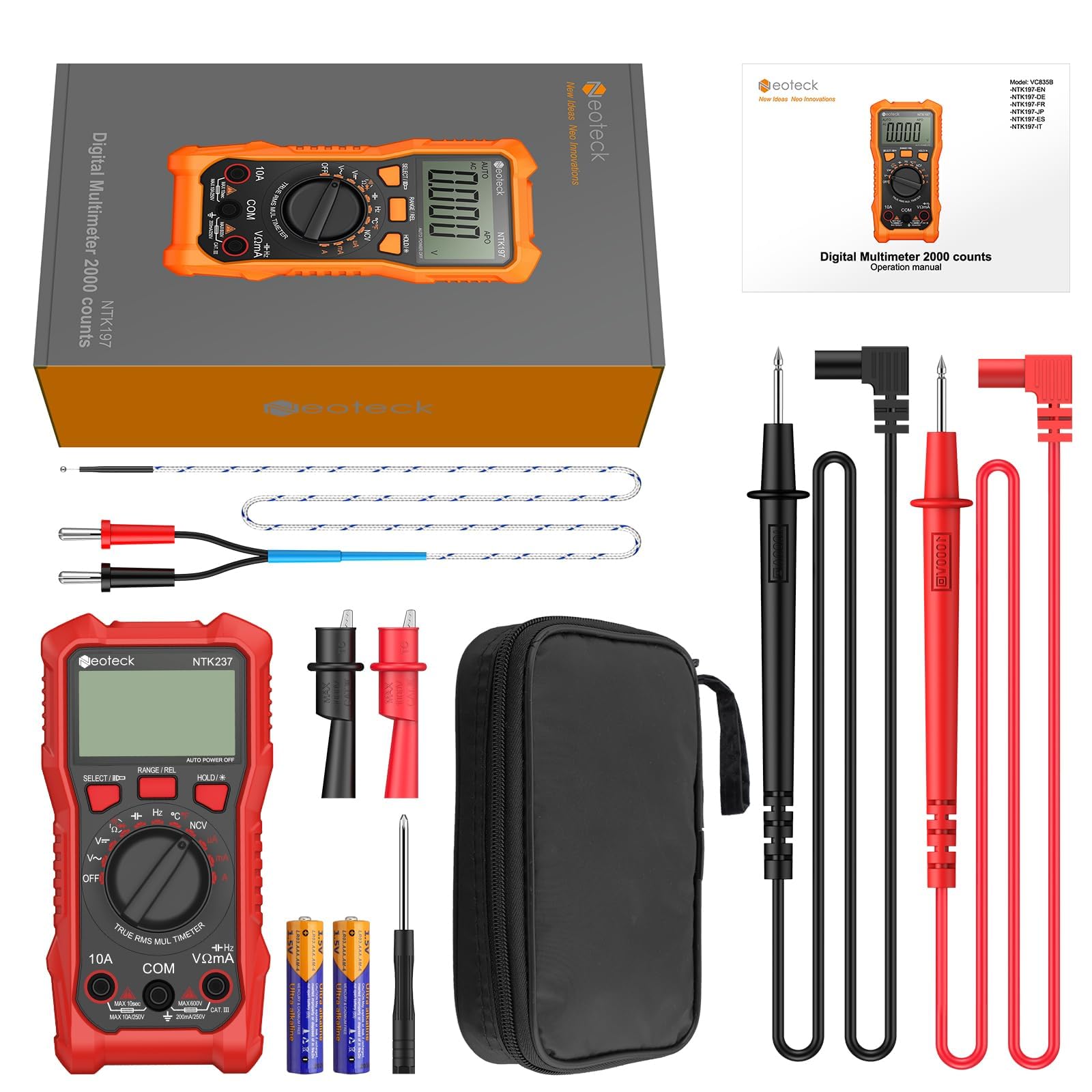 【2000 Counts Digital Multimeter】Neoteck 2000 counts multimeter can accurately measure DC/AC Voltage & Current, resistance, capacitance, frequency, duty cycle, continuity, diode ,temperature , live wire and NCV. In addition, its DC voltage accuracy up to ±(0.5%+4) and Ac voltage accuracy up to ±(0.8%+6),which helps locate faults or problems accurately.
