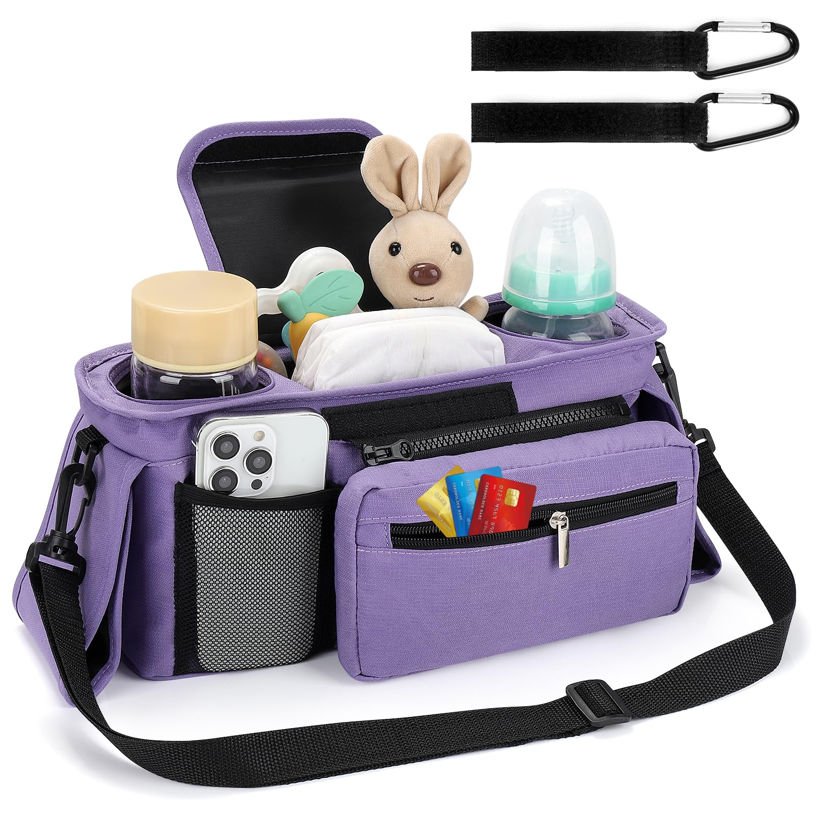 Multi Structure: This stroller storage organizer equipped with multifunctional structure: Insulated cup holders on both sides to place baby bottles and drink cups; The middle storage compartment can accommodate baby diapers, wipes, pacifiers, teething toys and other accessories; Equipped with a detachable and portable small bag, it is convenient for mothers to store important items such as cell phones, wallet etc.