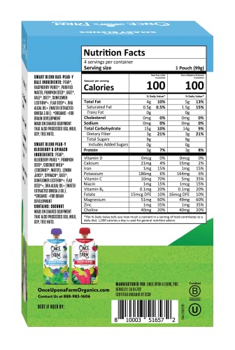 Wise up to these brilliant blends made by the smartest people we know: certified experts in nutrition. Our Smart Blends unite the nutritional know-how of organic, farm-fresh fruits and veggies plus flax seeds in a convenient kids pouch that even picky eaters can’t resist. Then, we add natural sources of Omega 3s and choline--ingredients known to help support brain health.