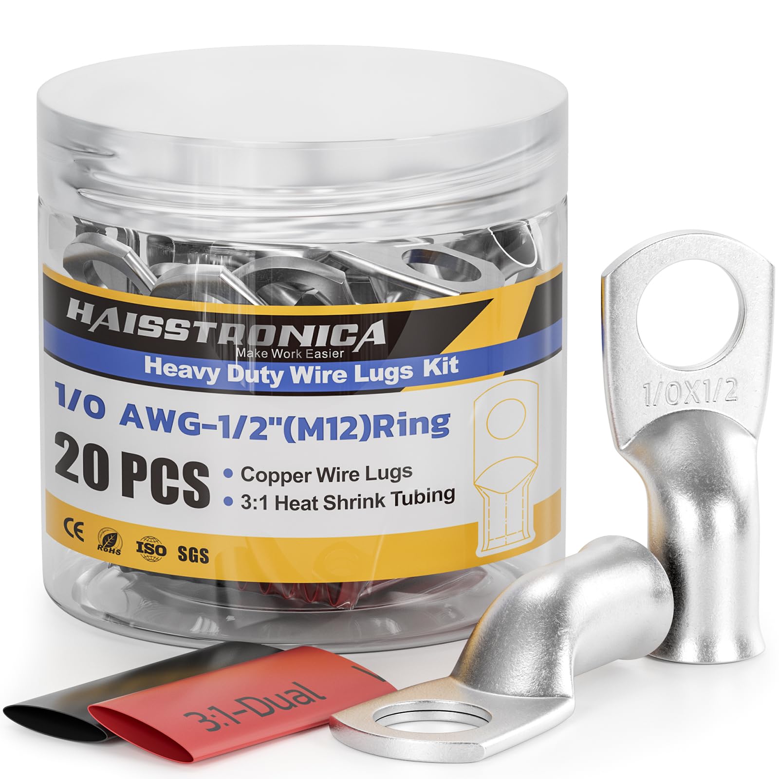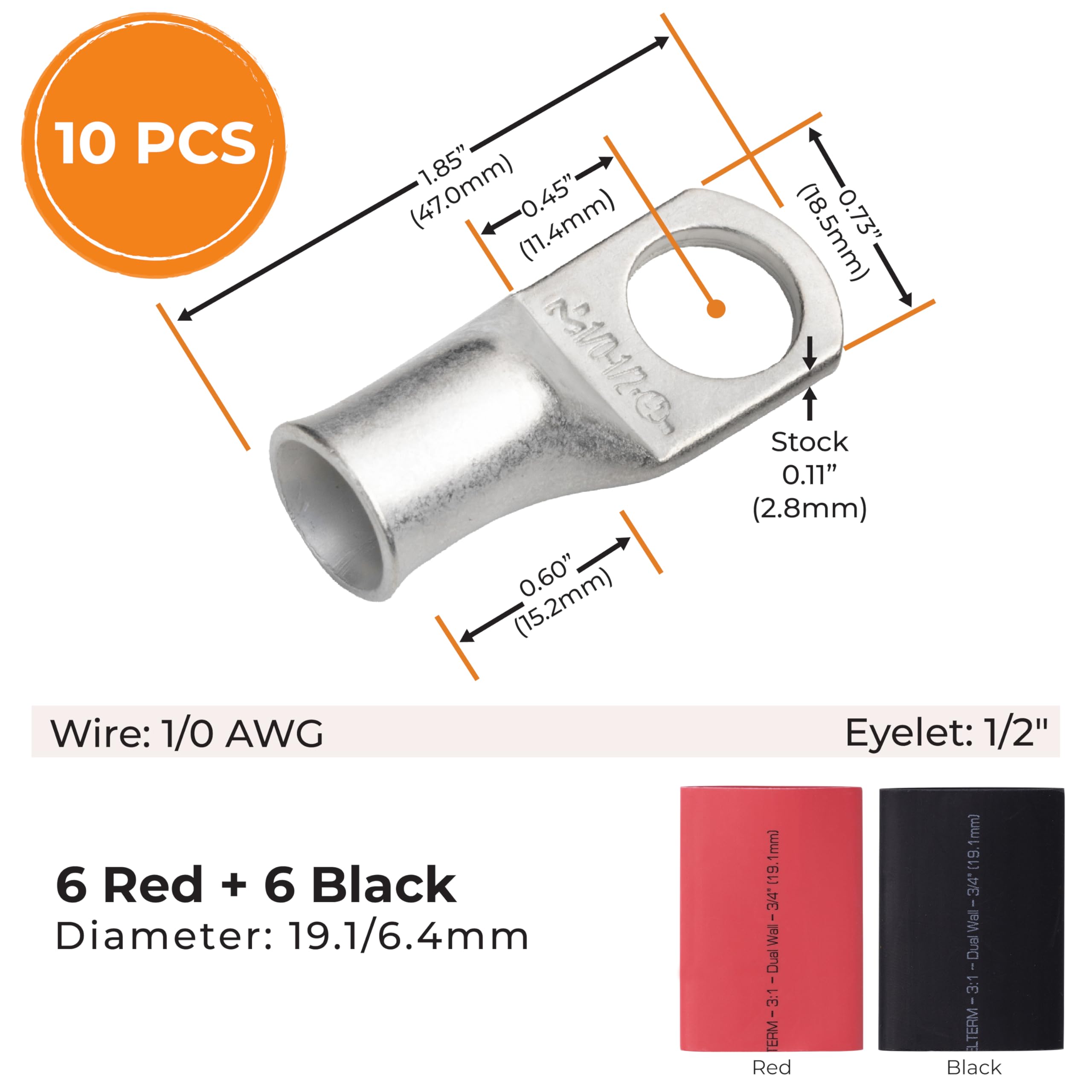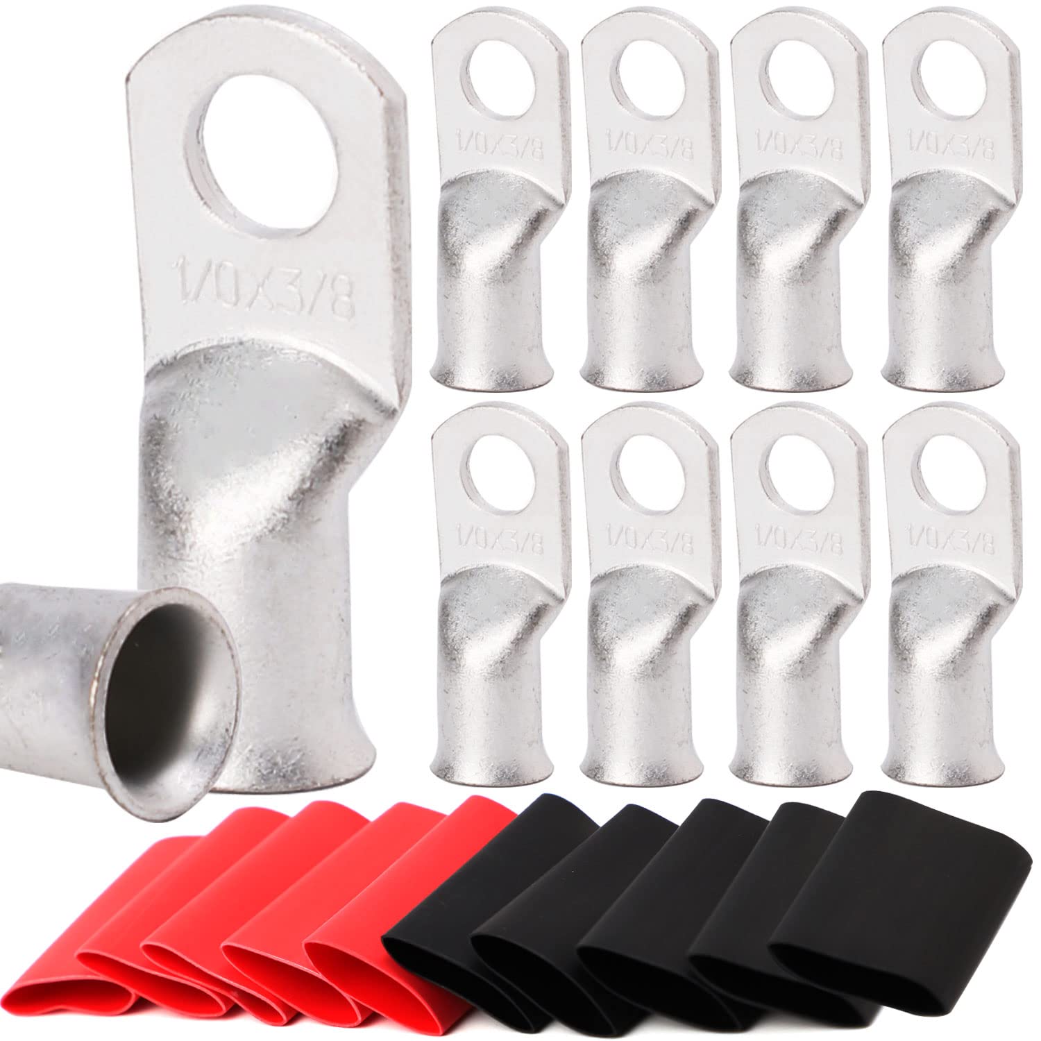 Package Contains: Each purchase includes 10pcs 1/0 AWG - 1/2" Stud Battery Lugs Ring Terminal Connectors, along with 12pcs 3:1 Black & Red Heat Shrink Tubing with Adhesive. This comprehensive kit provides all the essentials for maintaining efficient and lasting battery connections.