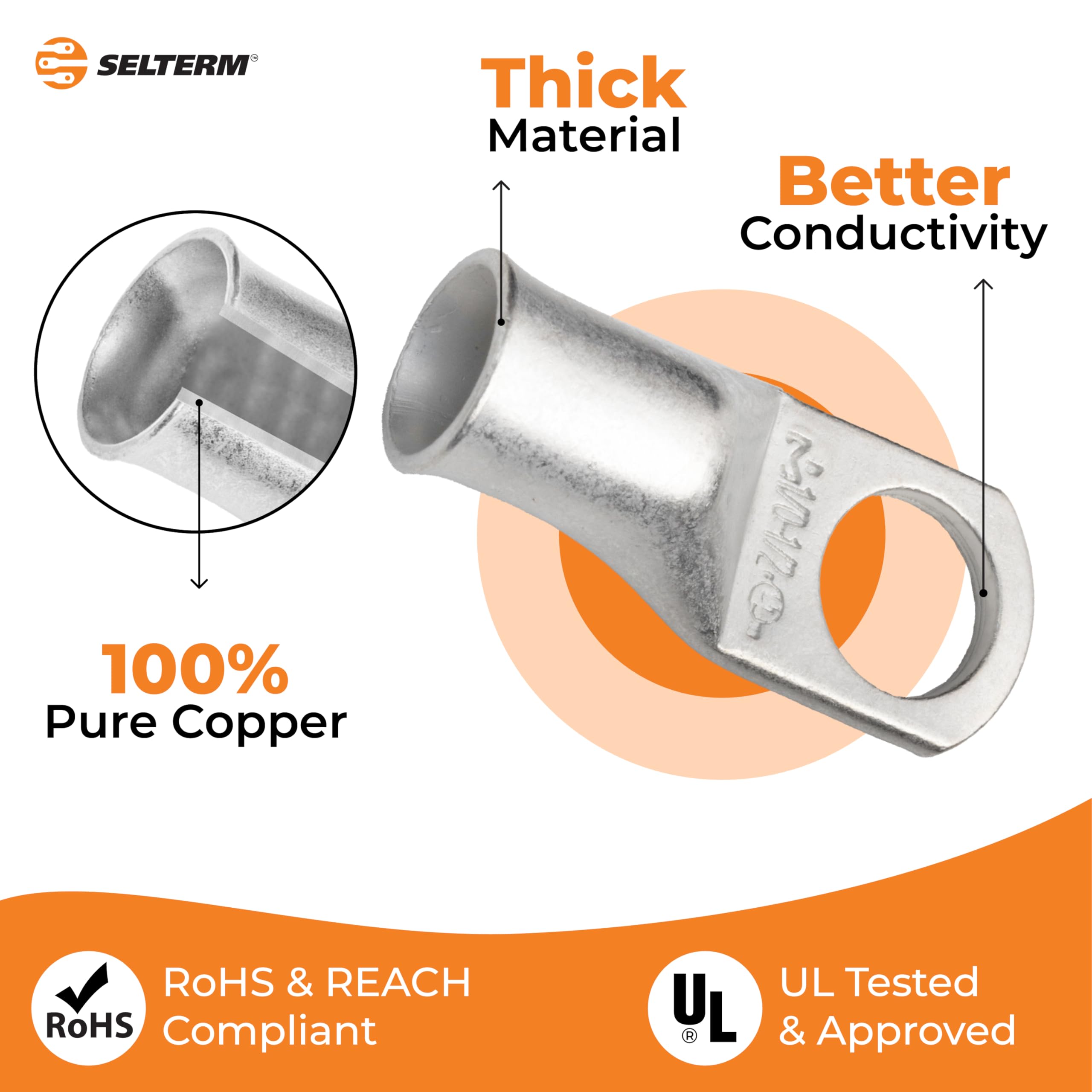 Secure and Reliable Connections: Ensure strong and dependable battery connections with Selterm 1/0 AwgAWG Ring Terminal Connectors. Approved by OEMs, our Tinned Copper wire ring connectors are corrosion free; ideal for marine, automotive or outdoor use; salt spray tested to ASTMB117 standard. Special matte tin plating make these lugs as easy to Solder as it is to Crimp.