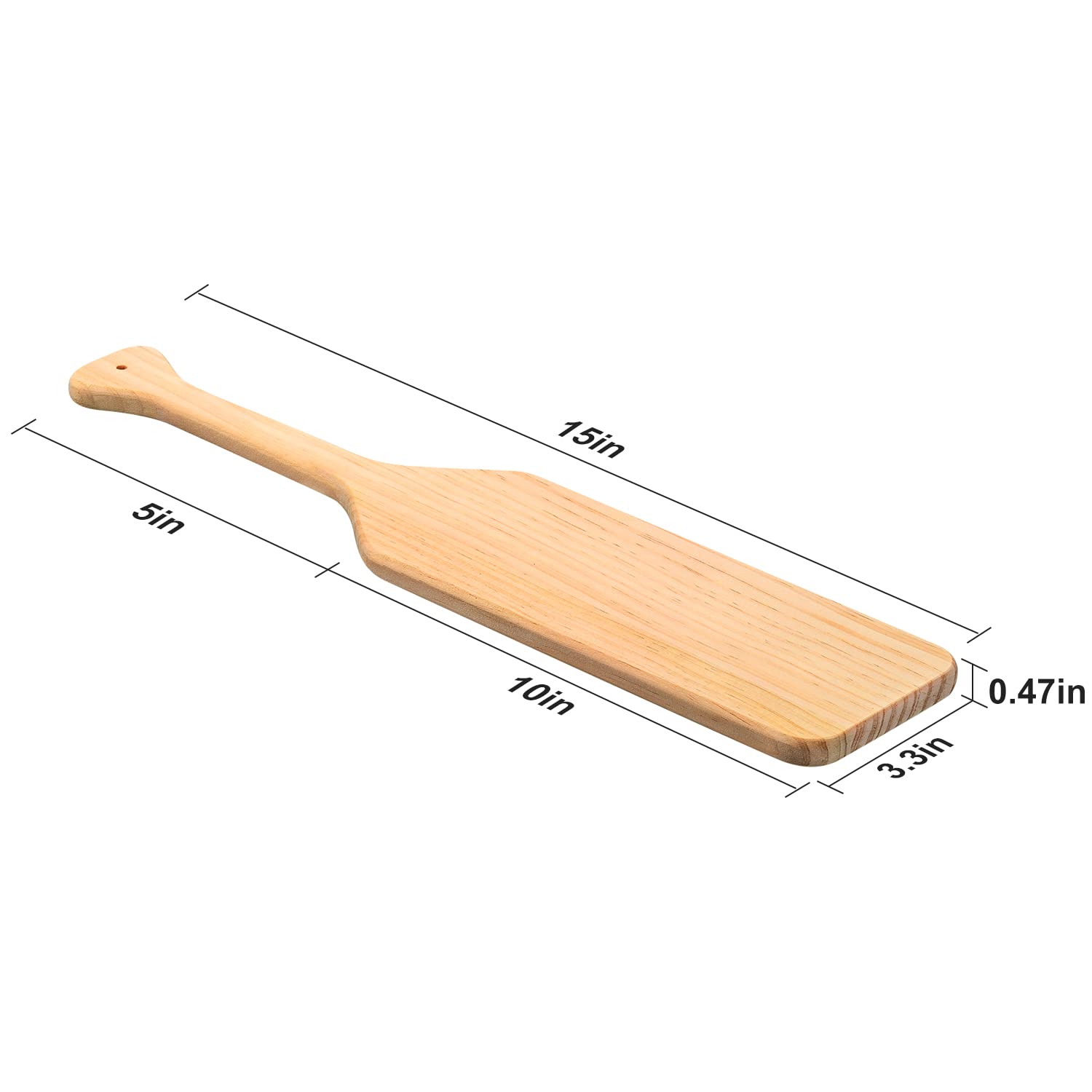 Dimensions: 15 x 3.3 x 0.47 inch unfinished wood, wooden handle measures 6 inches and the wooden board measures 9 inches, paddle with a hanging hole in the handle, it is planed, polished and decorated, with a very smooth surface, and the wood is a light color that absorbs paint and stains easily