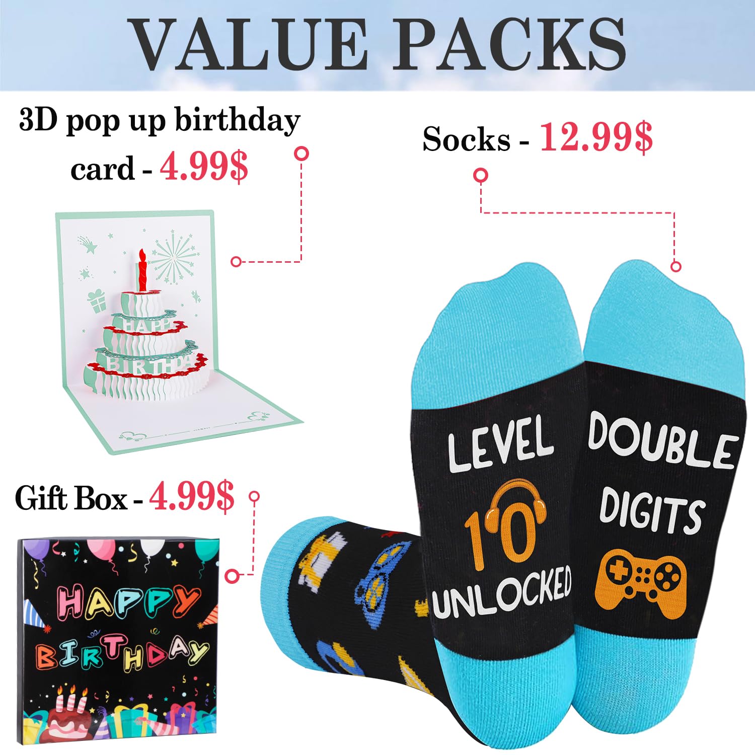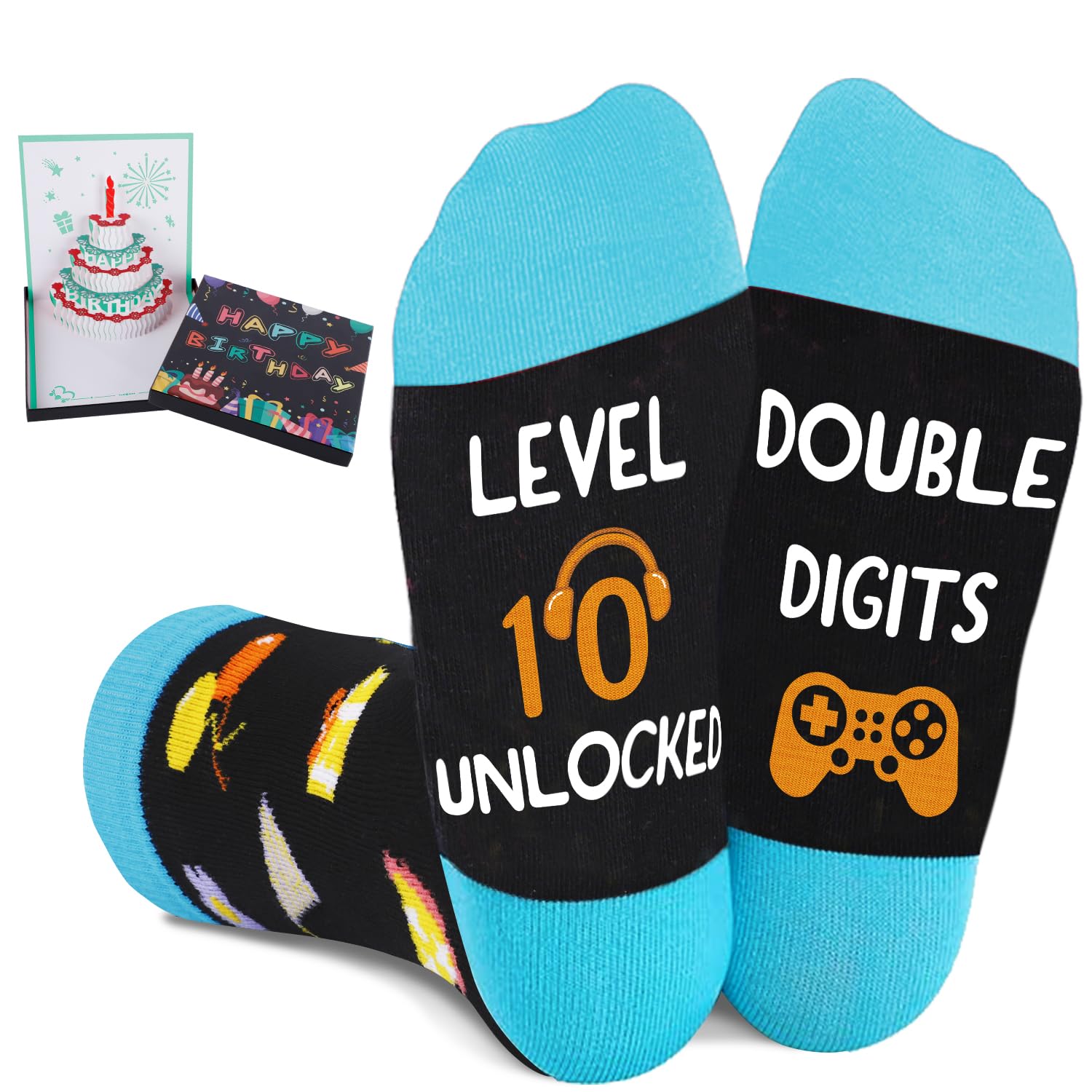 10 Year Old Boy Gifts: A pairs of socks special design for 10 birthday Boys, package also coming with a cute 3D pop up birthday card. Both items are packed in a beautiful gift box to emphasizes the surprise and enhances the joy of unwrapping the box, making the cool gifts for 10 Year Old Boy more memorable.It could be the perfect birthday gift for your Son, Grandson, or Nephew